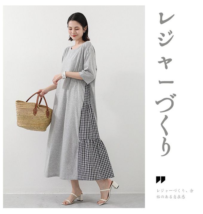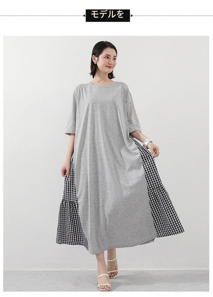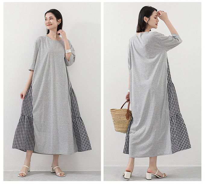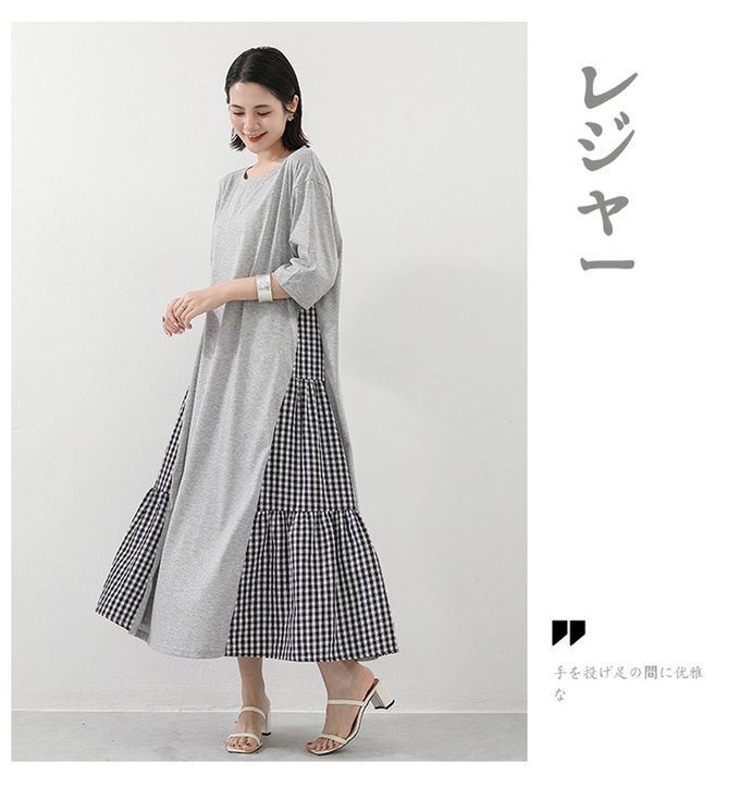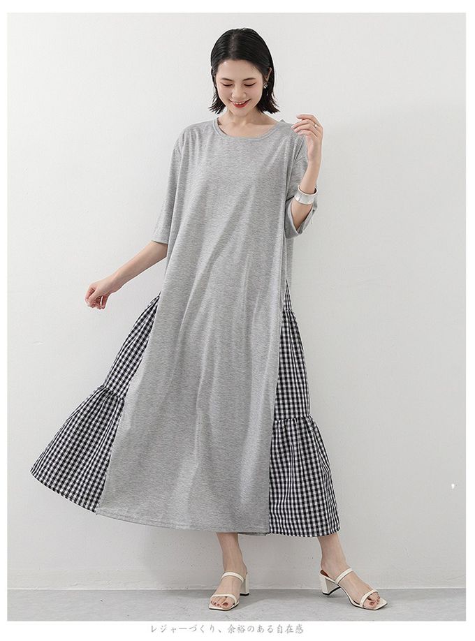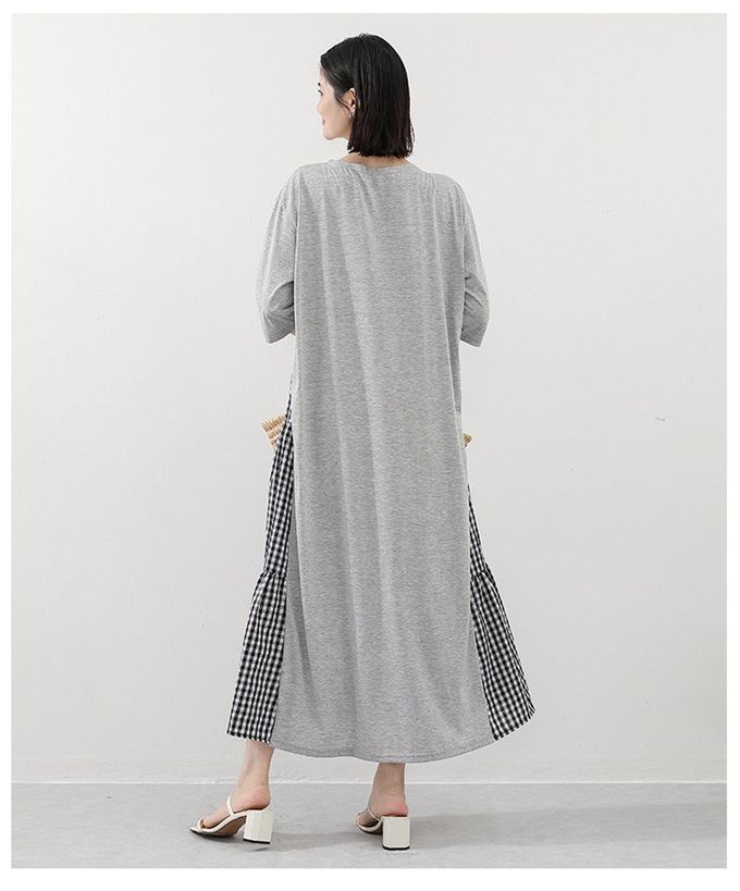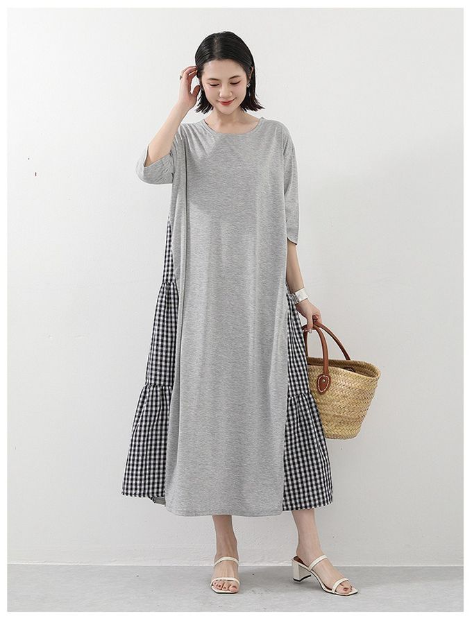 氣質顯瘦A字五分袖長洋裝-側拼接格子-灰色