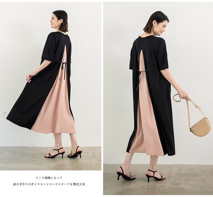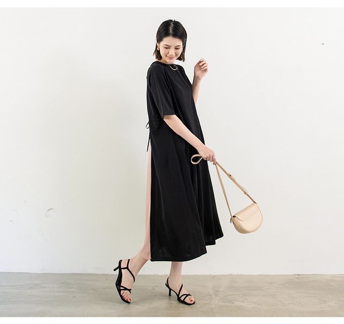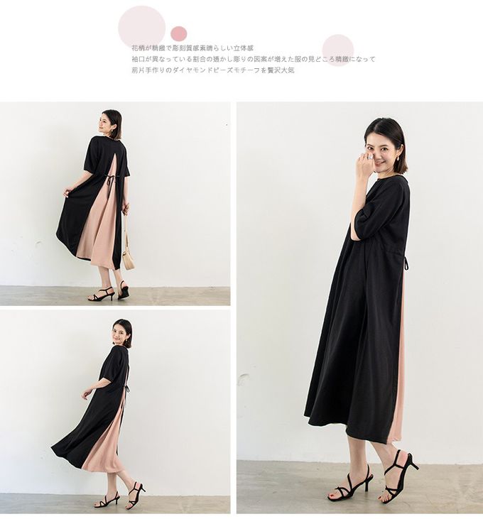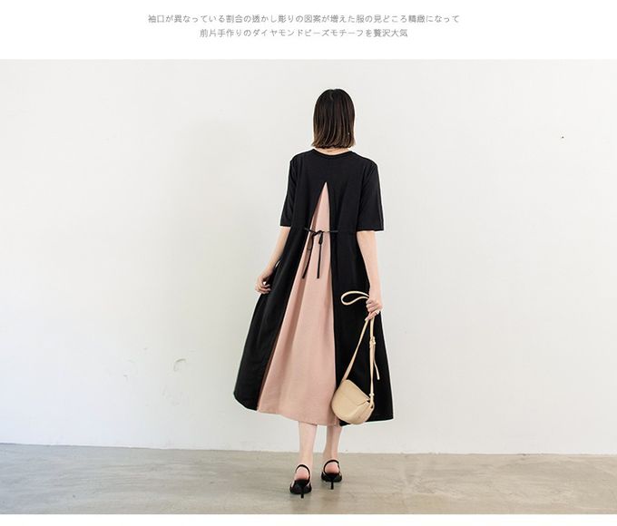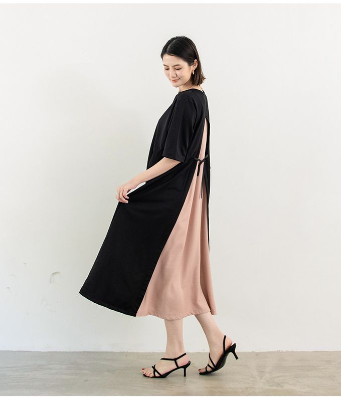 氣質顯瘦A字五分袖長洋裝-後拼接綁帶-黑+粉 (F)