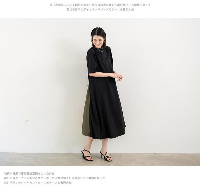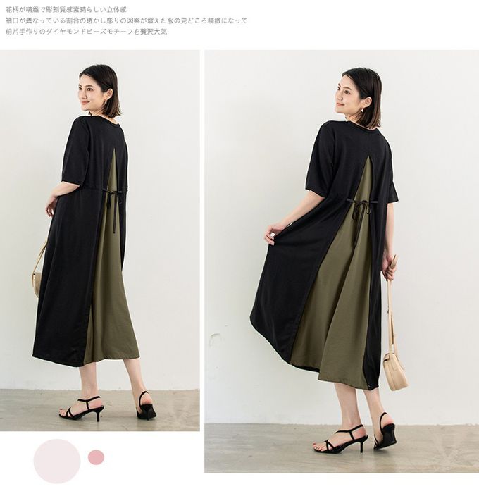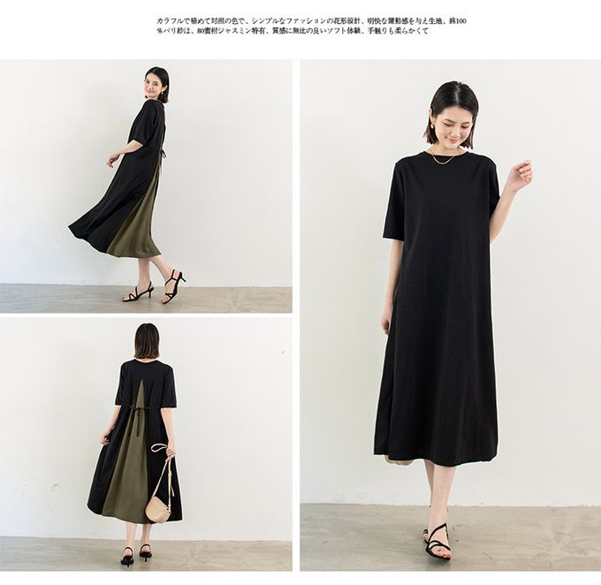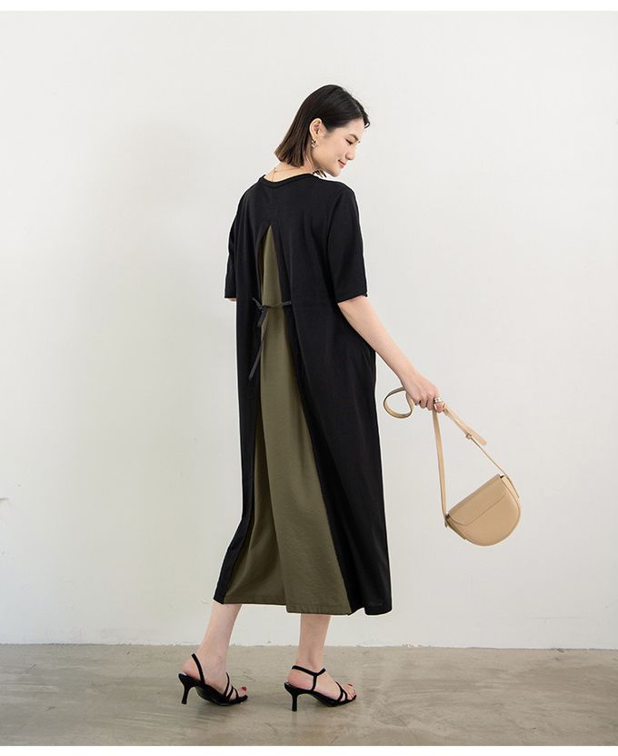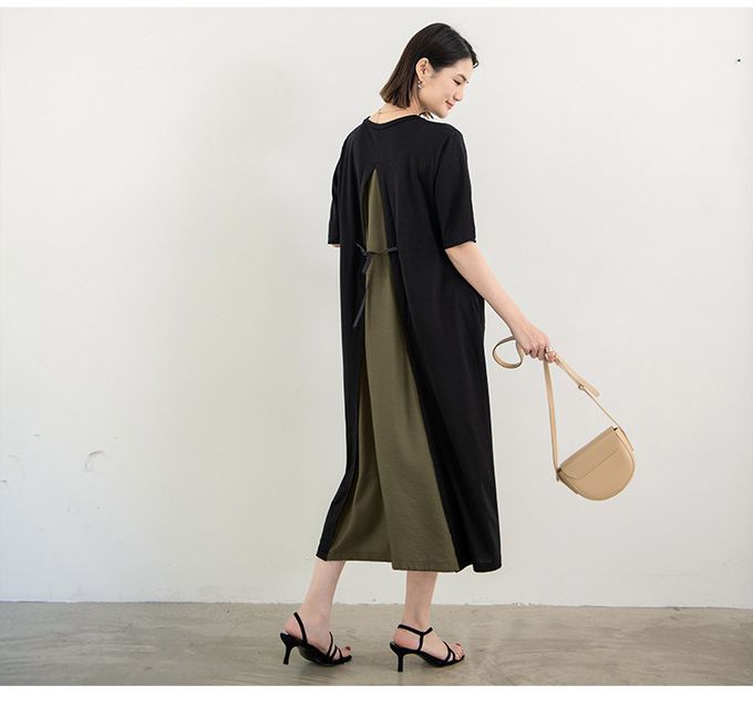 氣質顯瘦A字五分袖長洋裝-後拼接綁帶-黑+軍綠 (F)