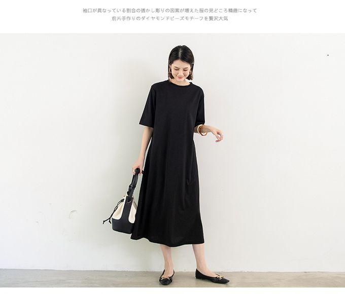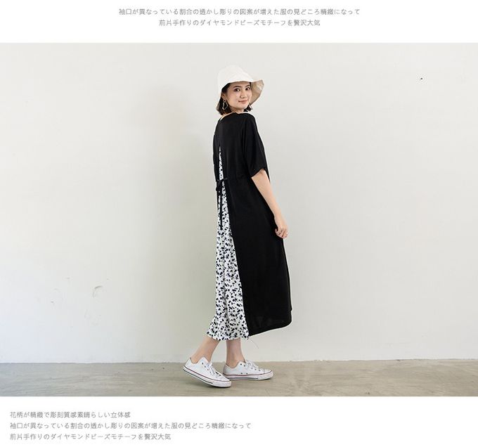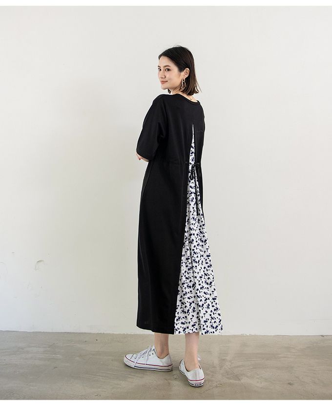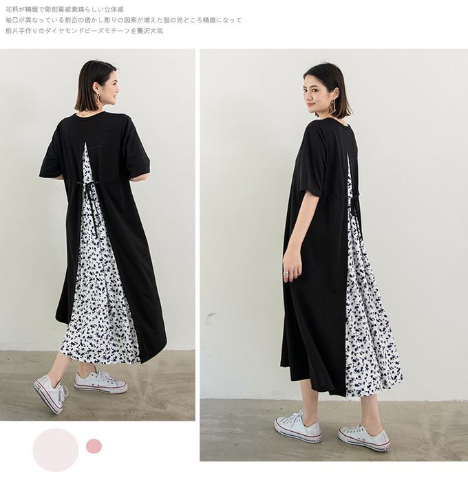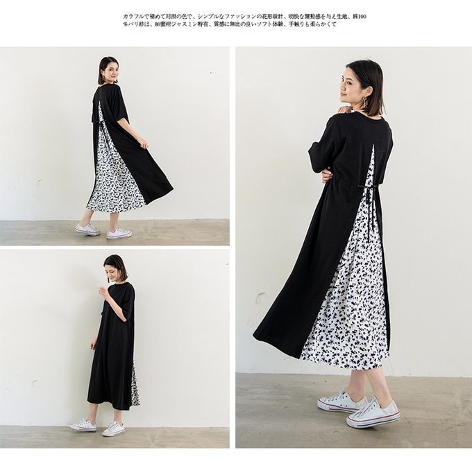 氣質顯瘦A字五分袖長洋裝-後拼接綁帶-黑+白底花 (F)