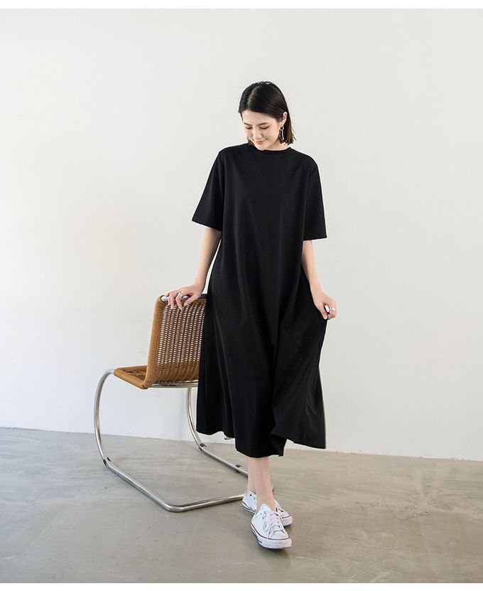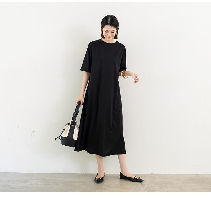 Yukié - 氣質顯瘦A字五分袖長洋裝-側拼接格子-黑色