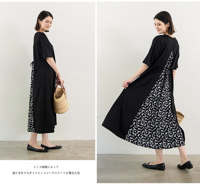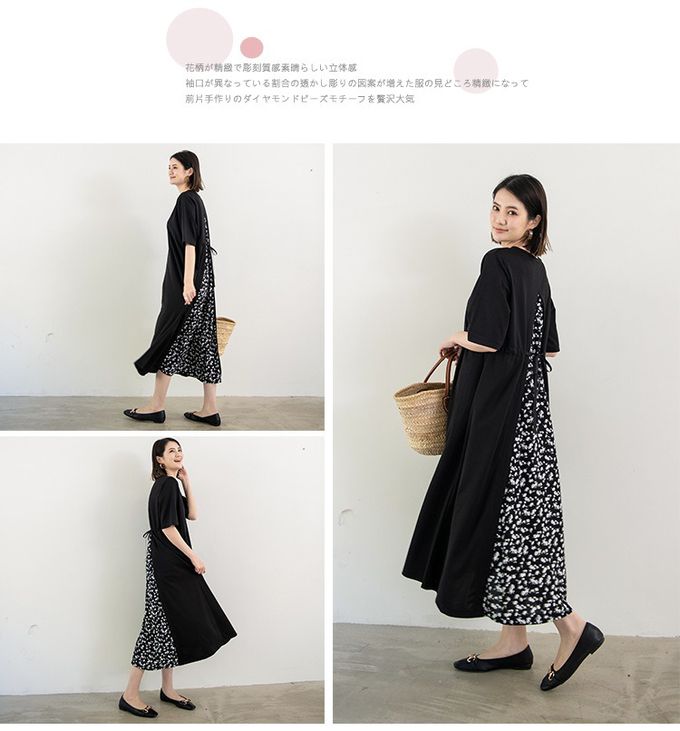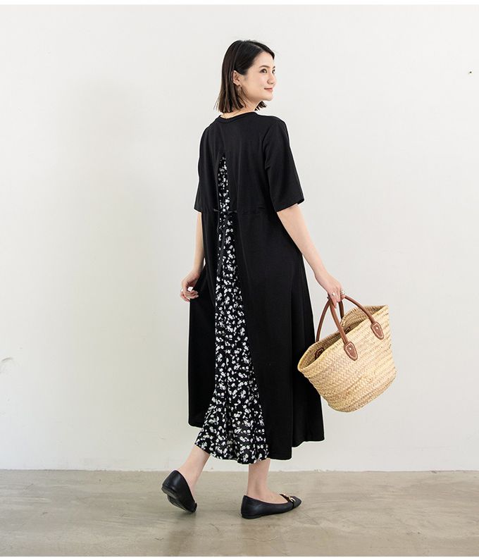 氣質顯瘦A字五分袖長洋裝-後拼接綁帶-黑+黑底花 (F)