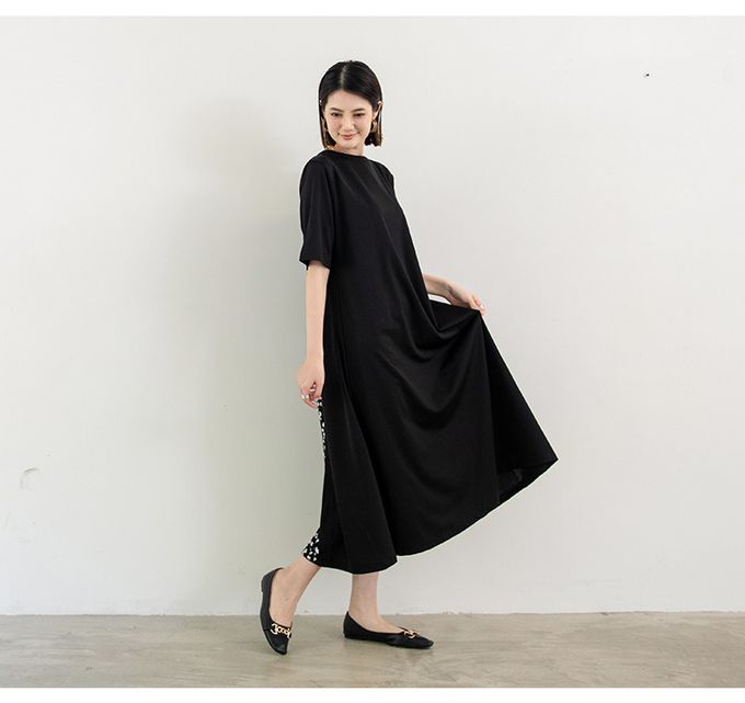 Yukié - 氣質顯瘦A字五分袖長洋裝-側拼接格子-黑色