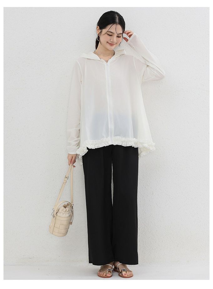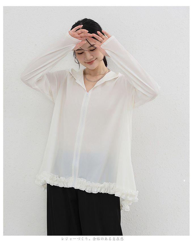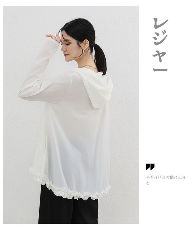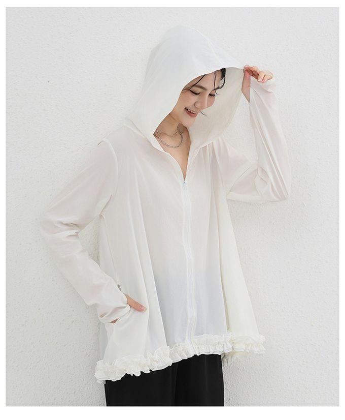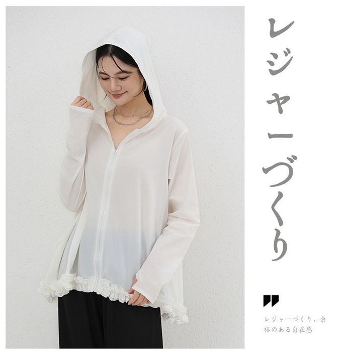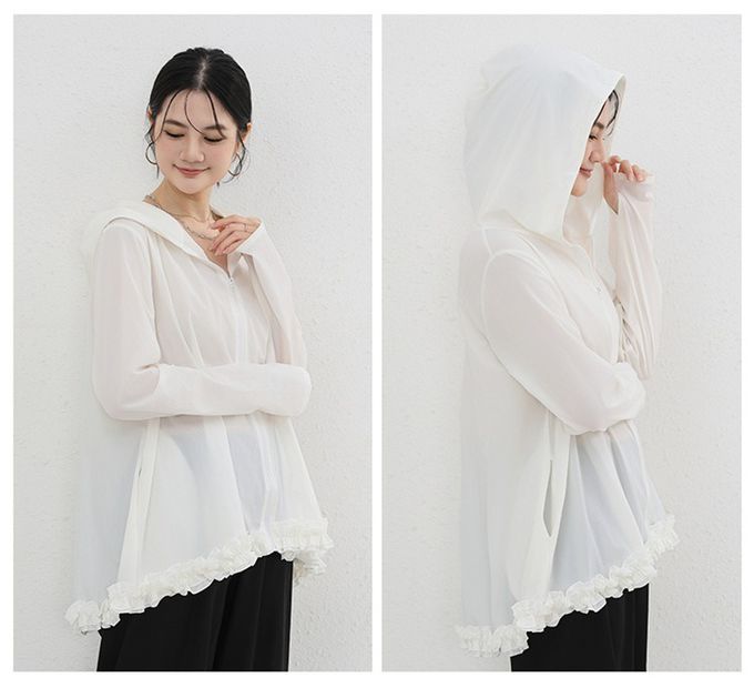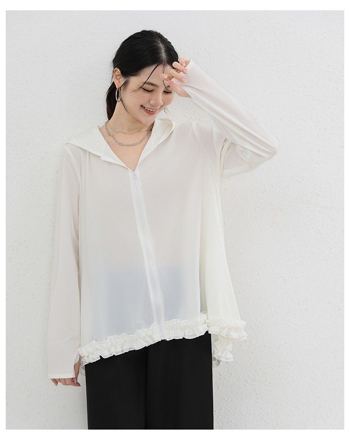 Yukié - 設計感前短後長連帽防曬外套-荷葉邊-米白色