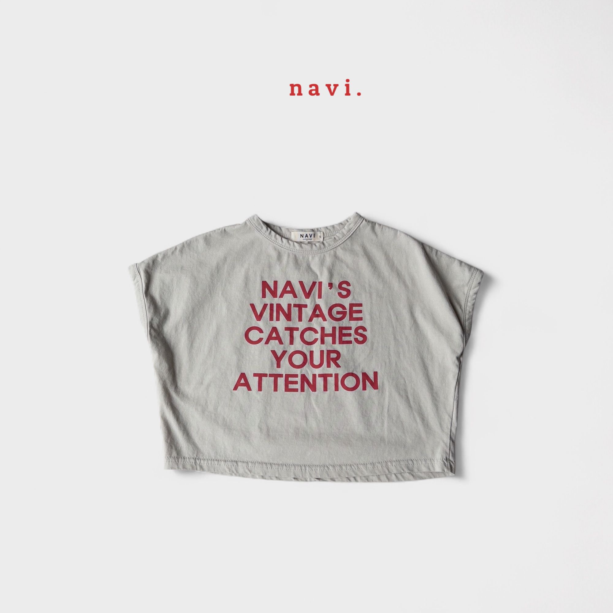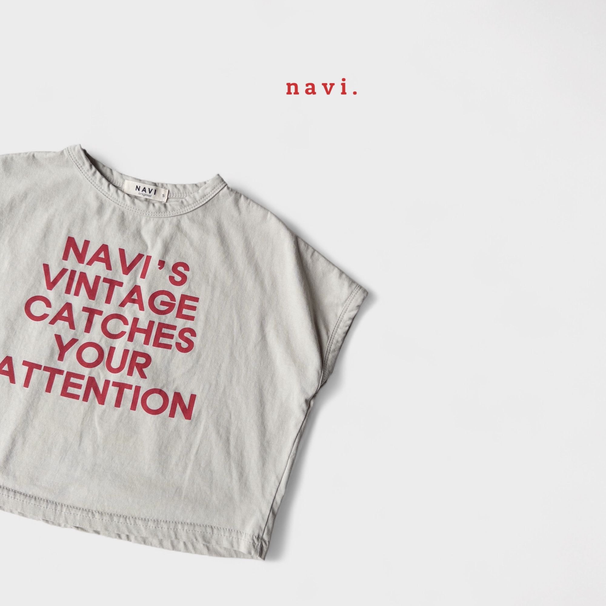 韓國 THE NAVi - 韓製100%純棉 NAVI文字落肩短袖上衣-淺灰