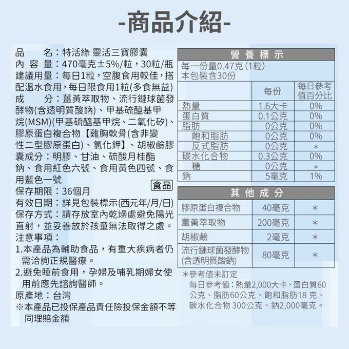品名:嚴選-特活綠 靈活三寶UC2膠囊 (30粒/瓶) 專利膠原蛋白複合物