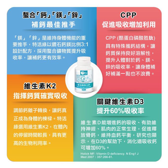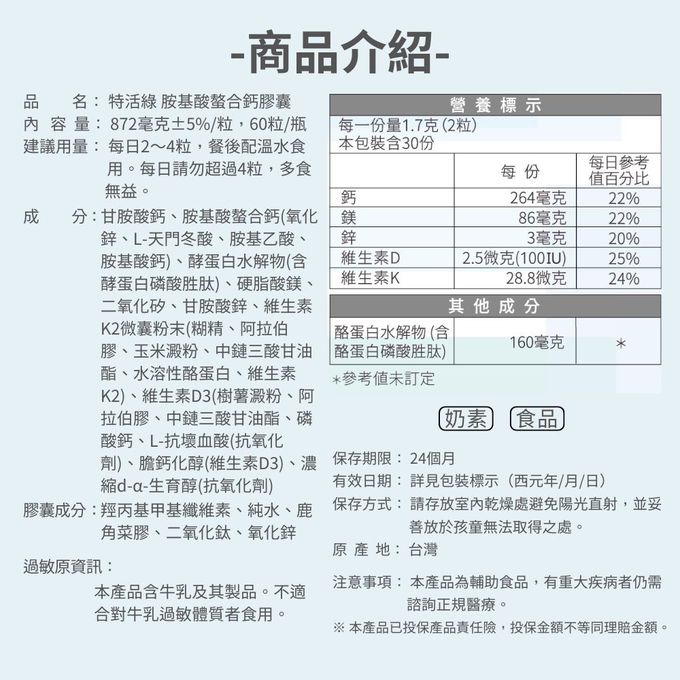 品名:嚴選-特活綠 胺基酸螯合鈣膠囊 (60粒/瓶)穩固調節配方 有感補鈣