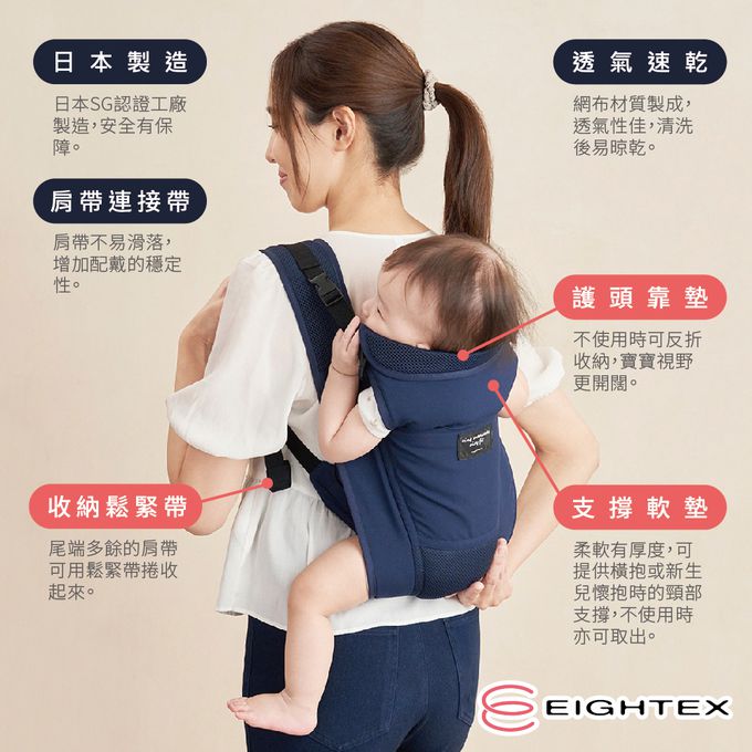兼具睡姿橫抱、新生兒懷抱、面對面前抱、向前前抱、後背等5項功能。