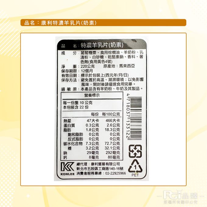 成分:牛乳片:葡萄糖漿、食用棕櫚油、奶粉、乳清粉、白砂糖、乾酪素鈉、香料、著色劑(食用黃色4號) 羊乳片:葡萄糖漿、食用棕櫚油、羊奶粉、乳清粉、白砂糖、乾酪素鈉、香料、著色劑(食用黃色4號)
