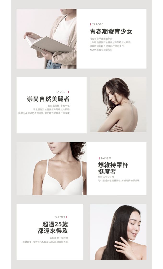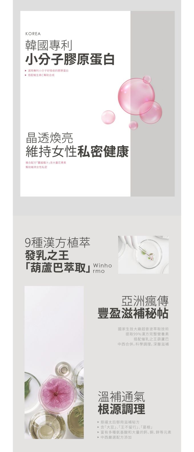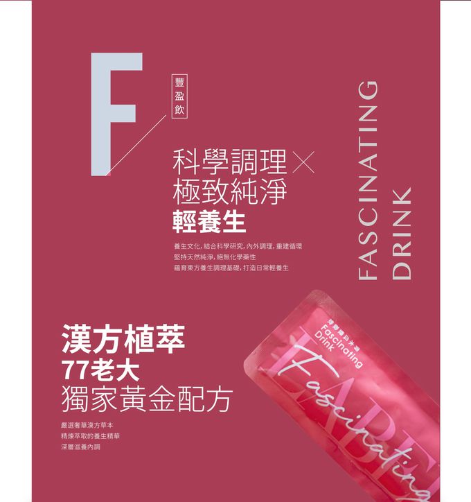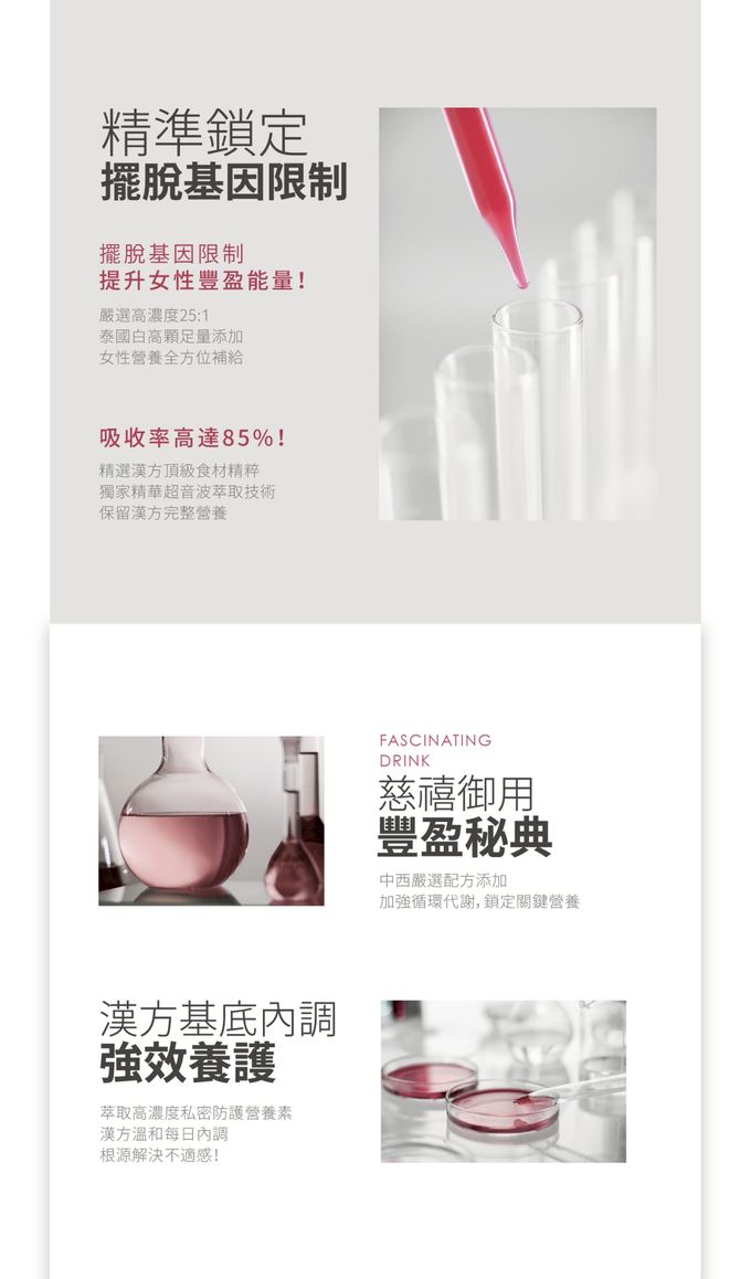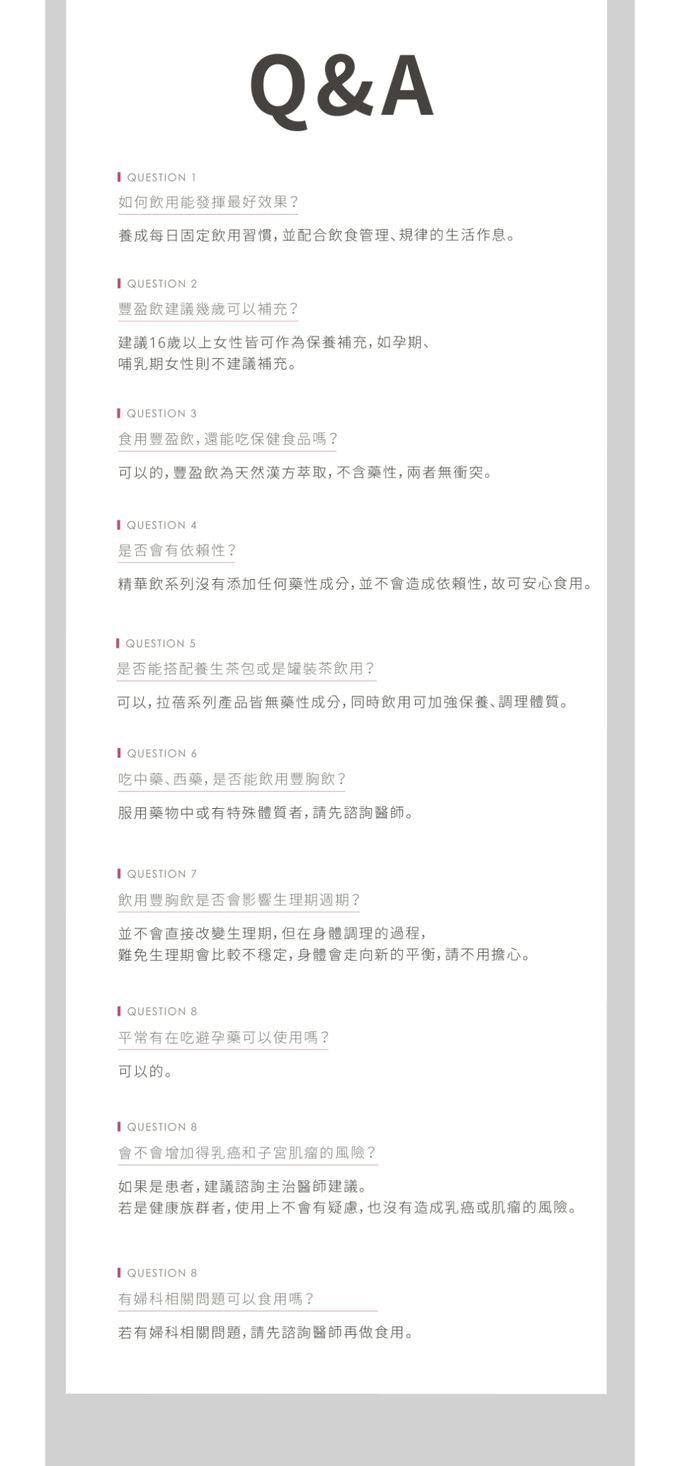 成分:植萃液(水、黃耆、紅棗、枸杞、王不留行、當歸)、異麥芽寡糖、紅葡萄濃縮汁、Winhormo™蔬果酸酵液(青木瓜、山藥)、魚膠原蛋白、白高顆萃取物、大豆萃取物、蔓越莓萃取物、刺五加萃取物(刺五加萃取物、麥芽糊精)、維生素C、葫蘆巴萃取物。