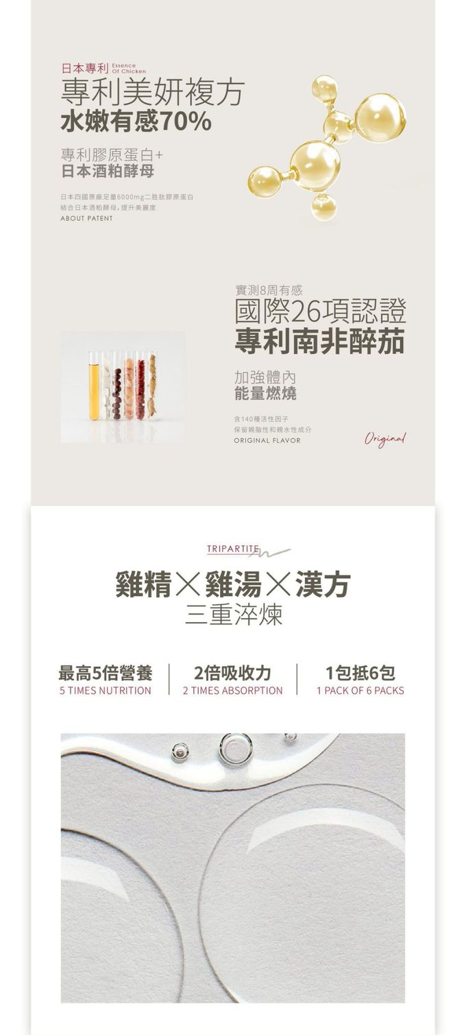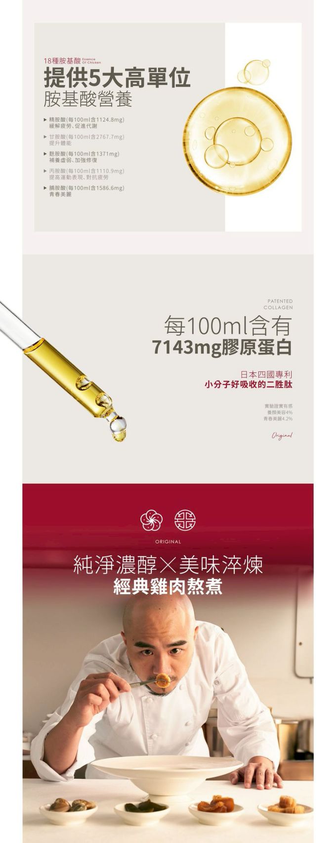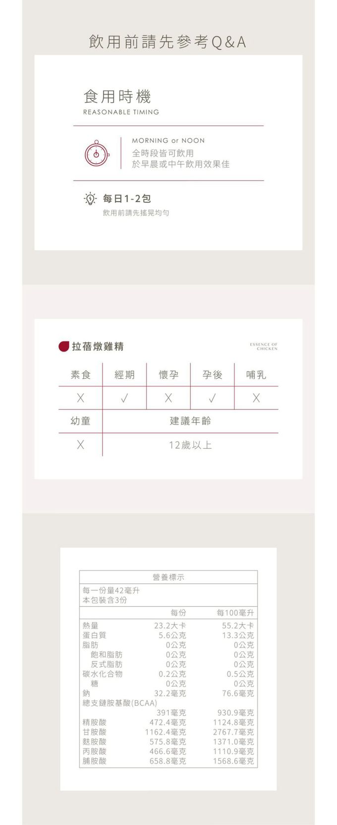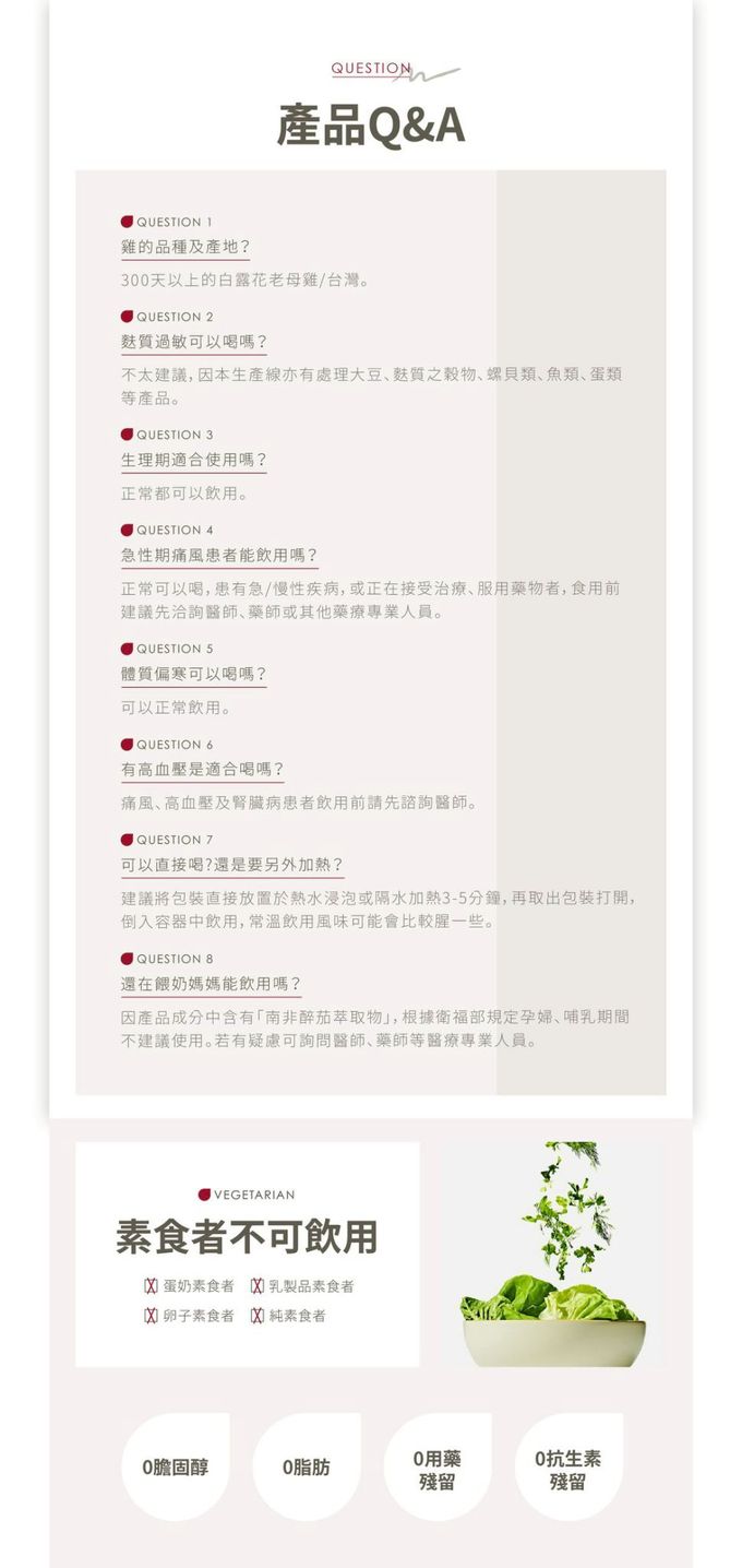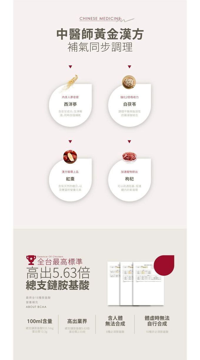 成分:熟齡母雞滴取液、濃縮雞湯(雞肉、水)、膠原蛋白(豬)、中藥水(雞肉、水、紅棗、白茯苓、枸杞)、南非醉茄萃取物(南非醉茄萃取物、牛奶)、酵母萃取物(酵母萃取物、糊精)、西洋蔘萃取液(水、西洋蔘、鹽)。
