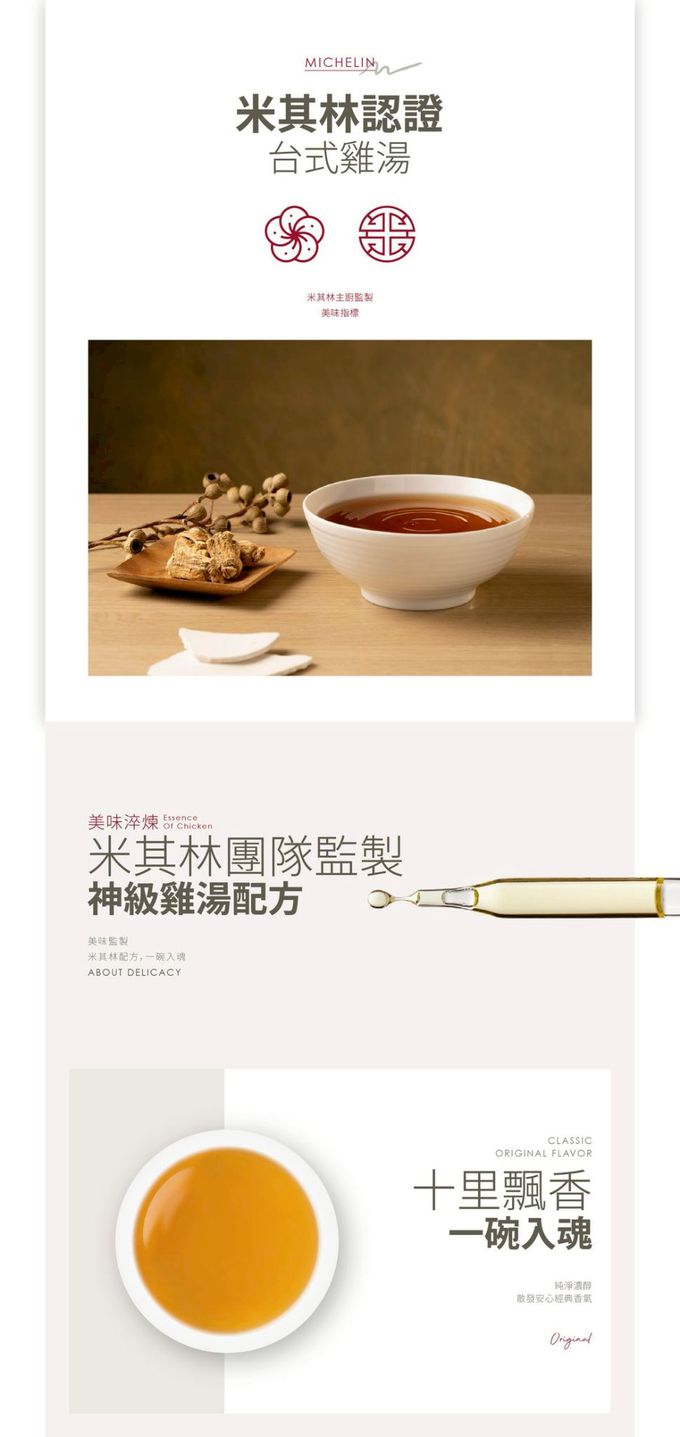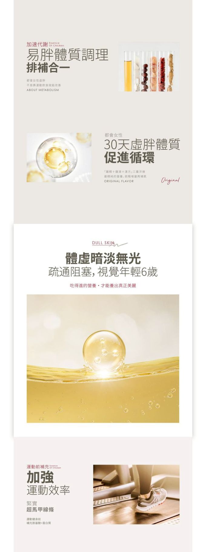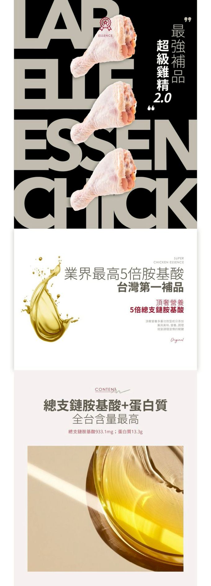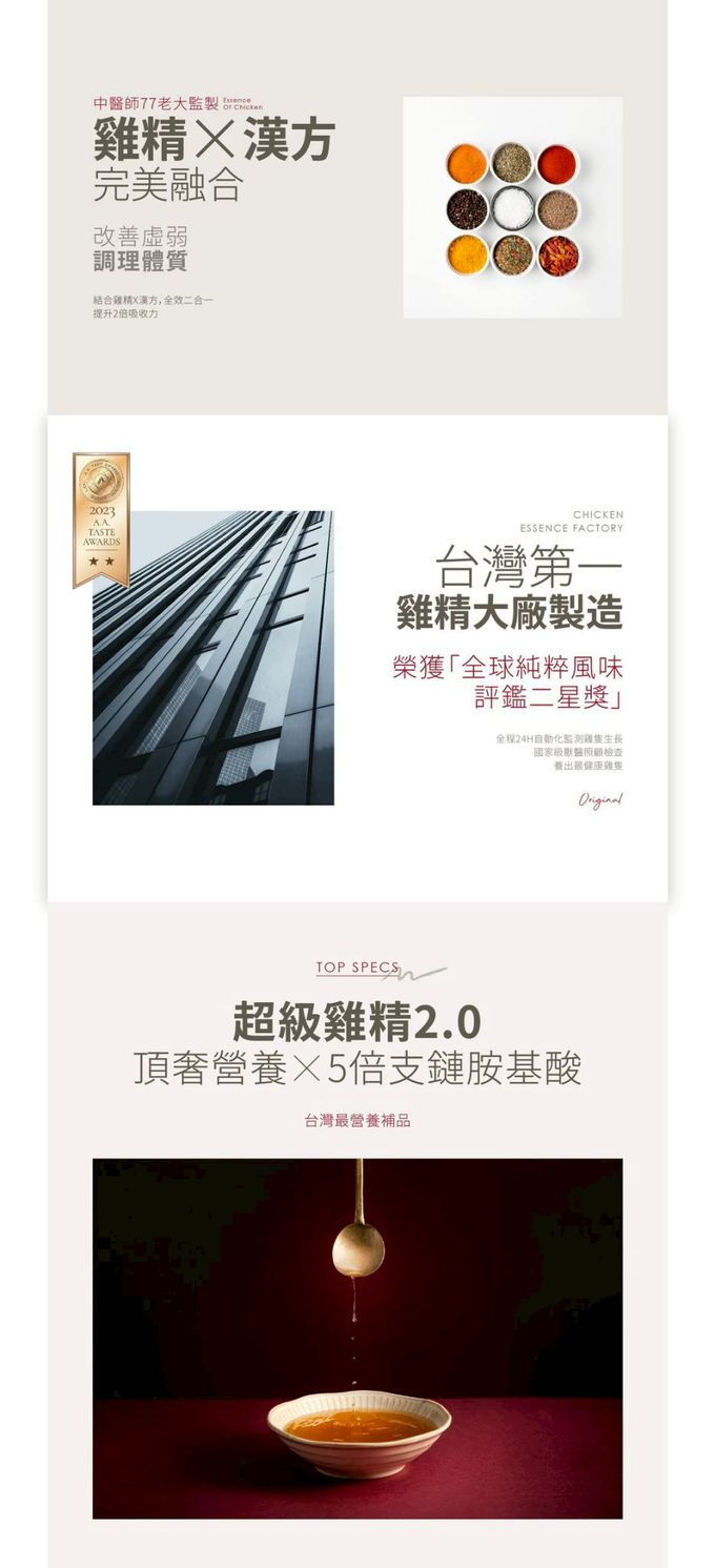 成分:熟齡母雞滴取液、濃縮雞湯(雞肉、水)、膠原蛋白(豬)、中藥水(雞肉、水、紅棗、白茯苓、枸杞)、南非醉茄萃取物(南非醉茄萃取物、牛奶)、酵母萃取物(酵母萃取物、糊精)、西洋蔘萃取液(水、西洋蔘、鹽)。