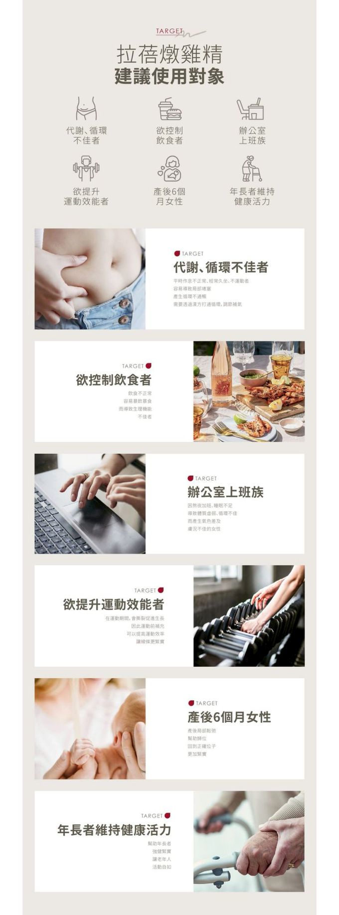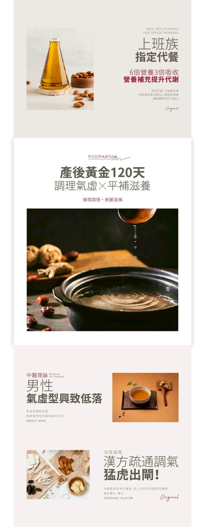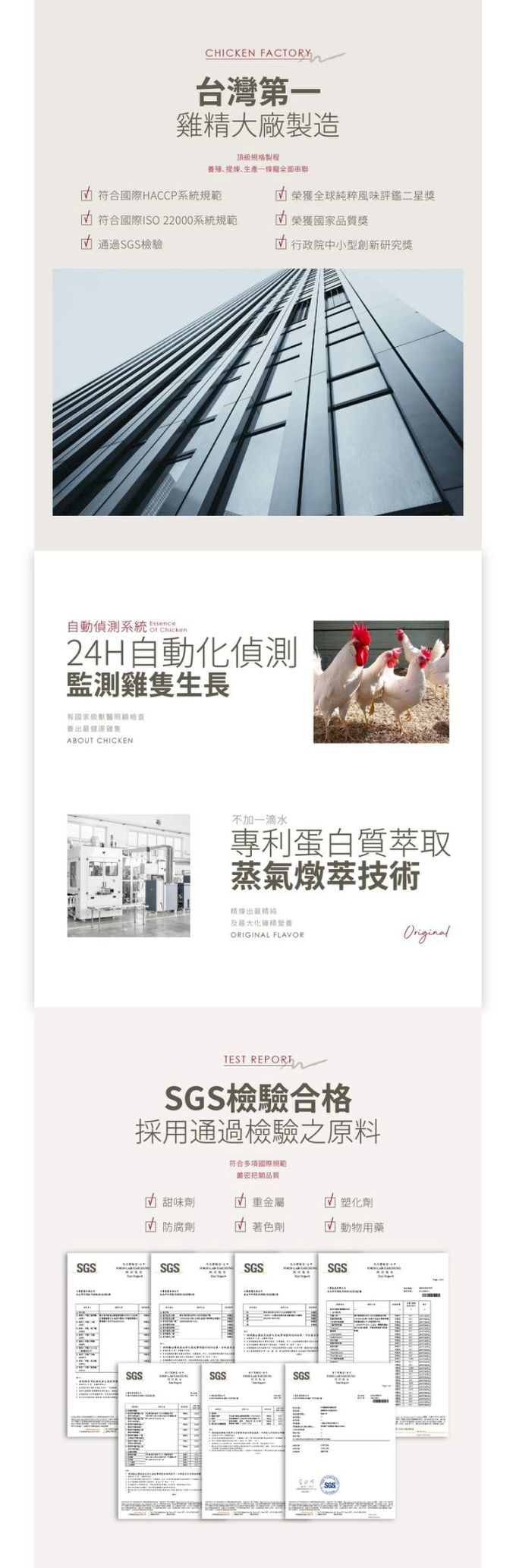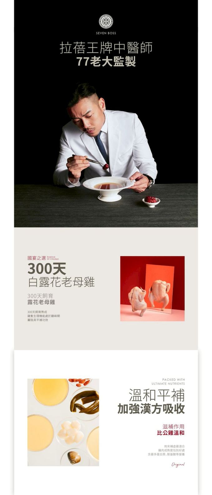 成分:熟齡母雞滴取液、濃縮雞湯(雞肉、水)、膠原蛋白(豬)、中藥水(雞肉、水、紅棗、白茯苓、枸杞)、南非醉茄萃取物(南非醉茄萃取物、牛奶)、酵母萃取物(酵母萃取物、糊精)、西洋蔘萃取液(水、西洋蔘、鹽)。