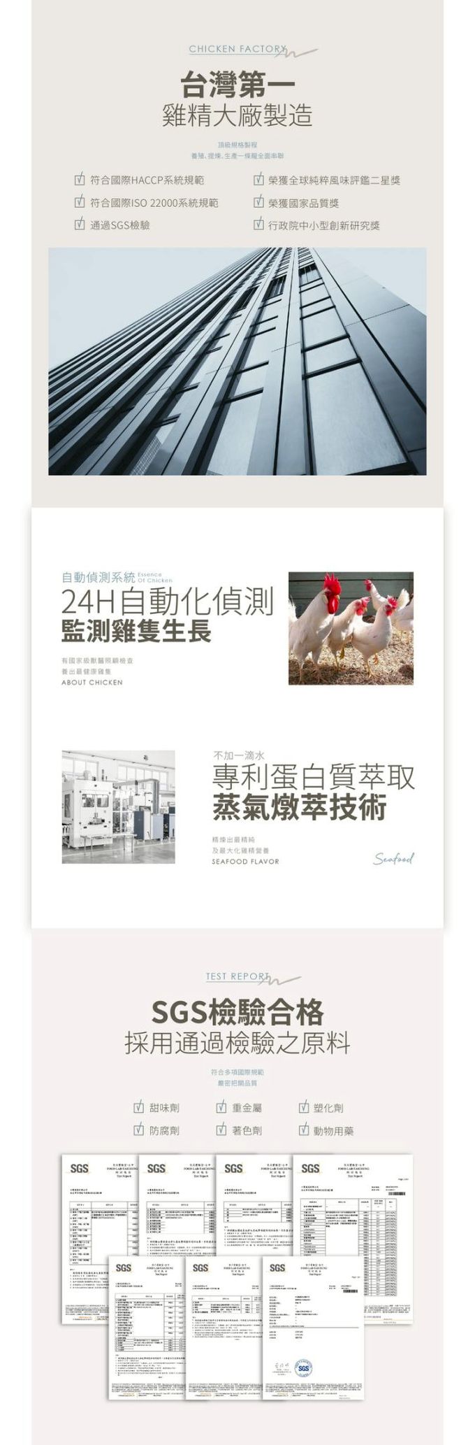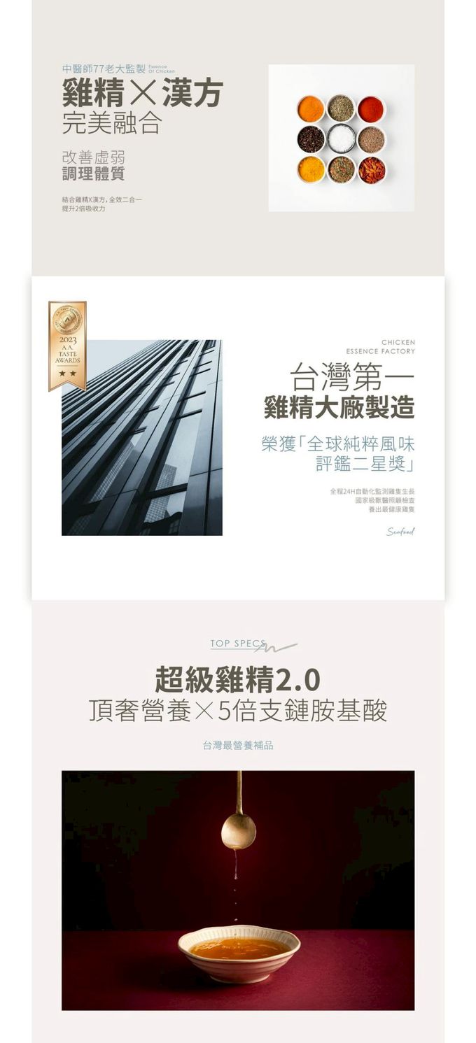 成分:蛤蠣干貝湯{水、雞肉、米酒、昆布抽出物、蛤蜊精風味調味料[L-麩酸鈉、胺基乙酸、琥珀酸二鈉、5’-次黃嘌呤核苷磷酸二鈉、5’-鳥嘌呤核苷磷酸二鈉、蛤蜊精粉(糊精、蛤肉抽出物、鹽、琥珀酸、反丁烯二酸)]、珠貝、薑、蛹蟲草子實體(Cordyceps militaris,固態培養)、冰糖、鹽}、膠原蛋白(豬)、濃縮雞湯(雞肉、水)、熟齡母雞滴取液、西洋蔘萃取液(水、西洋蔘、鹽)、酵母萃取物(酵母萃取物、糊精)、南非醉茄萃取物(南非醉茄萃取物、牛奶)、中藥水(雞肉、水、紅棗、白茯苓、枸杞)。