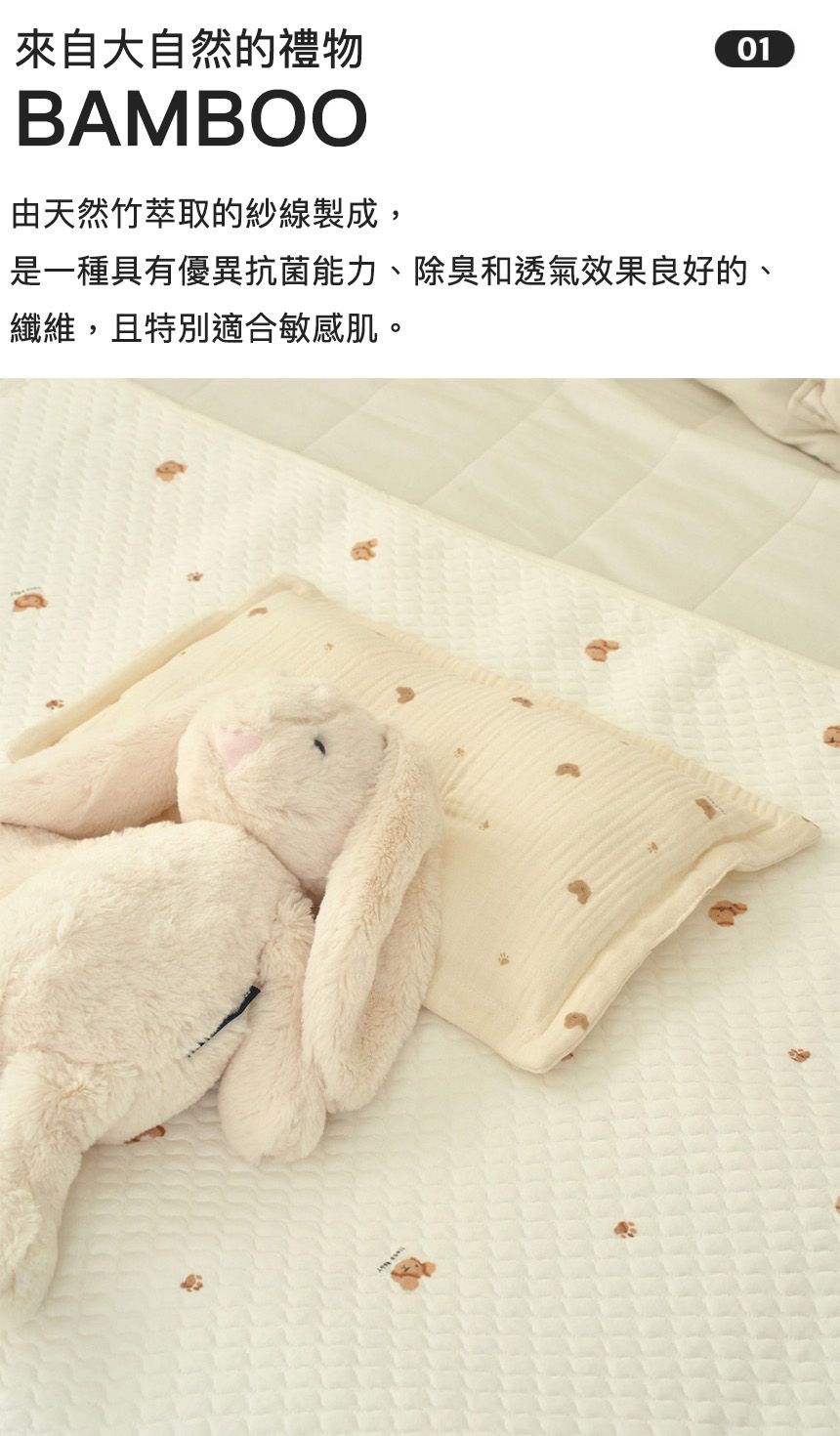 竹纖維防水墊的表面材質為 100% 竹纖維,抗菌除臭又柔軟,特別適用於敏感肌呦!背面 PU 防水不滲透~