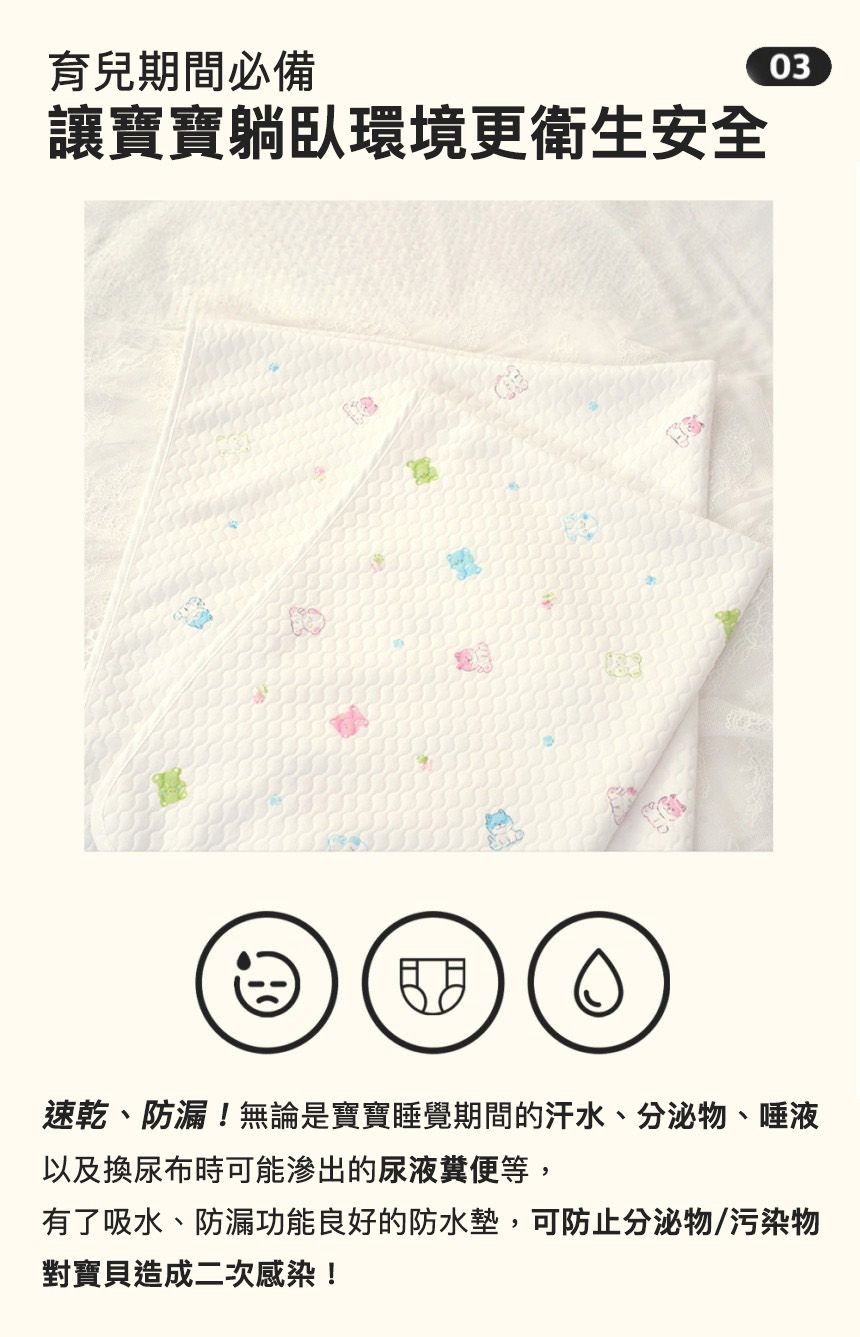 即使寶貝突發性大量排尿,也能瞬間吸收,維持乾爽,確保一夜好眠。簡單守護床墊與寢具,潔淨空間輕鬆擁有!