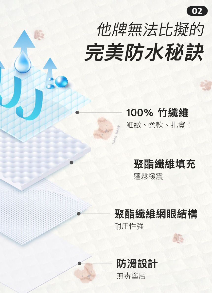 多層結構兼顧了親膚柔軟、扎實、吸水,還自帶止滑層,超・止・滑!鋪了之後再也不怕防水墊跑來跑去ヽ(*´∀`*)ノ!