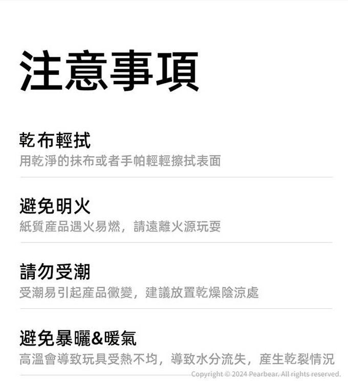 注意事項:為維護兒童安全,請在成人監督下使用,本玩具內 含小物件,有銳邊或尖端,或者兩者皆有,不適合 未滿3歲兒童使用,且應避免吞食造成窒息。為避 免嬰兒或兒童產生窒息之危險,請於拆卸後,立即 將塑膠袋遠離嬰兒及兒童。請遠離火源。