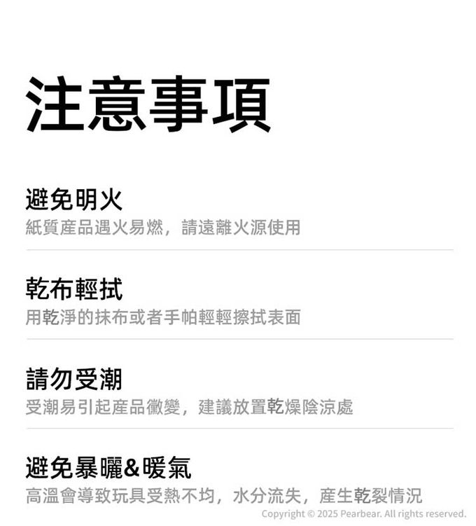 注意事項:為維護兒童安全,請在成人監督下使用,本玩具內 含小物件,有銳邊或尖端,或者兩者皆有,不適合 未滿3歲兒童使用,且應避免吞食造成窒息。為避 免嬰兒或兒童產生窒息之危險,請於拆卸後,立即 將塑膠袋遠離嬰兒及兒童。請遠離火源。