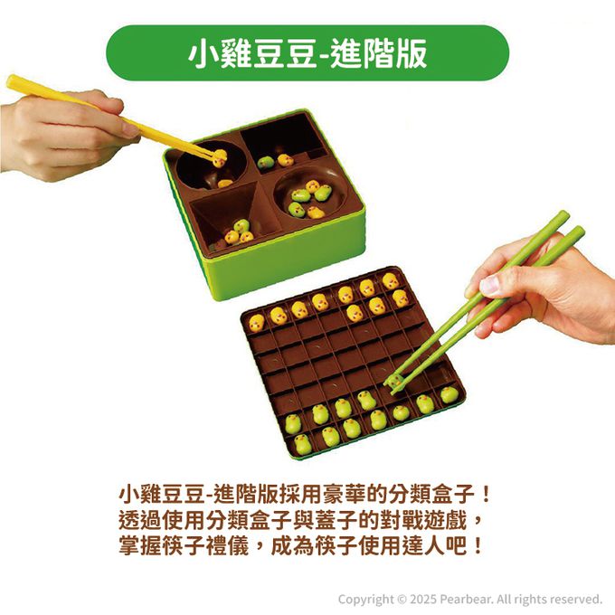 小雞豆豆進階版,8歲兒子超喜歡的,説好像便當盒,塑膠筷子很滑,小朋友不容易夾,可以用橡皮筋增加阻力,加強孩子信心度, 兒子喜歡拿他的學習筷與媽媽對戰速度。