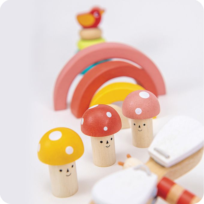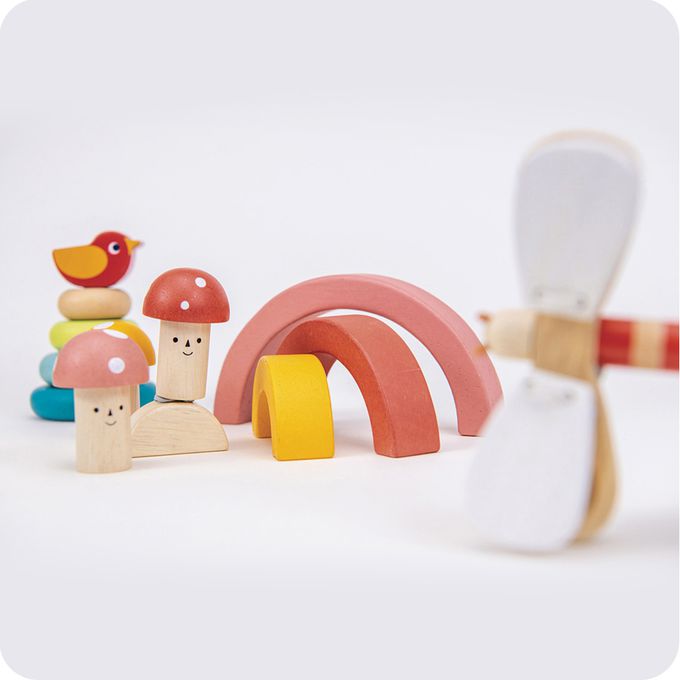 專為18至24個月大的幼童設計的感統木育啟蒙組,透過教玩具讓幼兒健全發展。內含4個有趣又好玩的早教玩具,是給孩子最好的啟蒙禮物。小鳥疊疊樹,訓練手眼協調;繽紛彩虹積木組,開放式玩法訓練建構能力;蘑菇敲敲樂,鍛鍊手腕的穩定度和蜻蜓手響板,提升音樂的感受力。