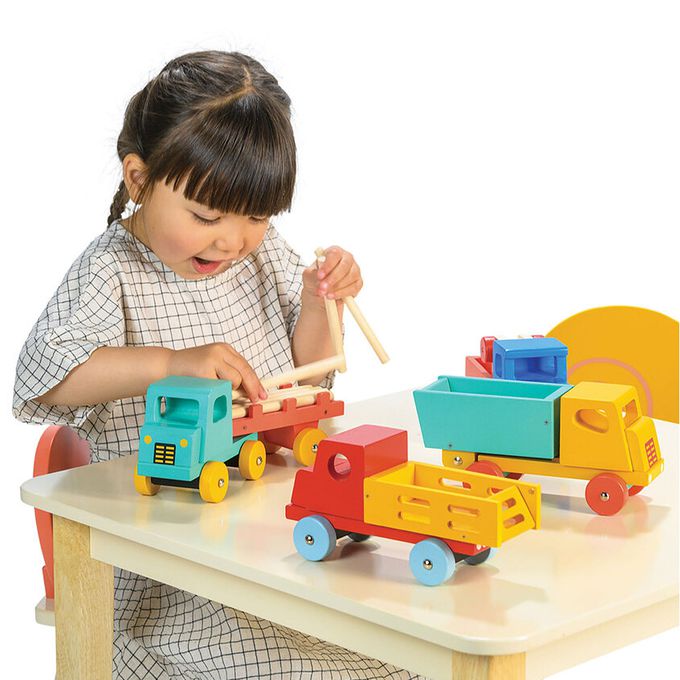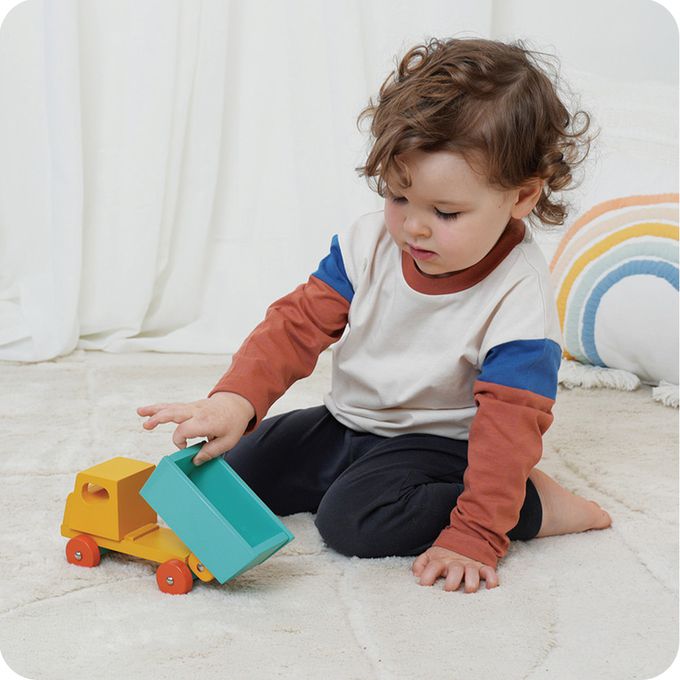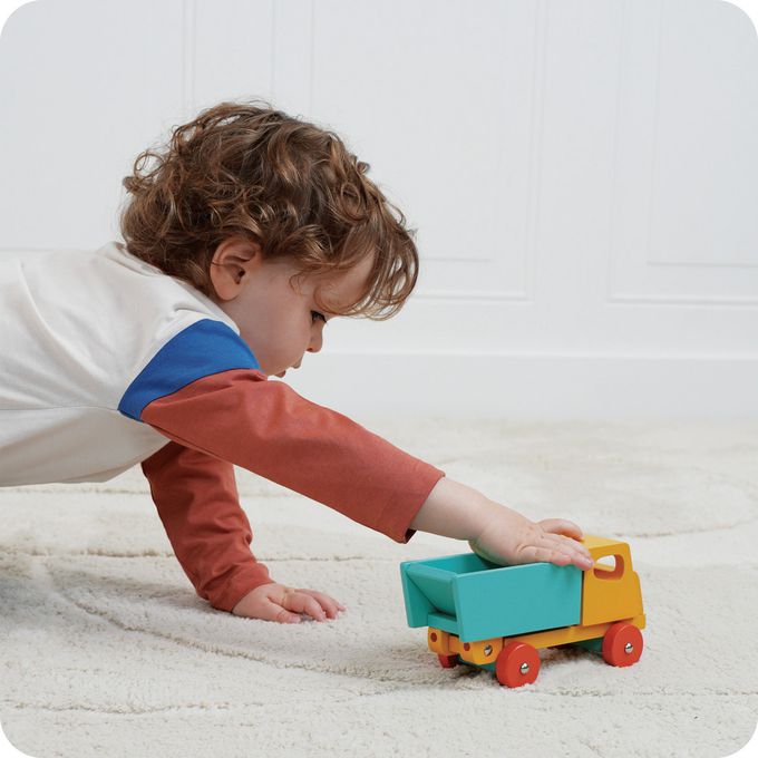 精典復古的運輸車系列,讓孩子沉浸在車車的世界裡面。黃與湖水綠配色的陽光翻斗貨車,將載著貨物運送到目的地並完成卸載的作業。用手來回推動和卸載貨物,訓練孩子的手部肌肉和操控能力。
