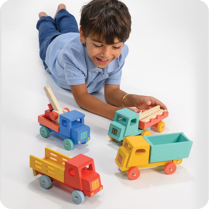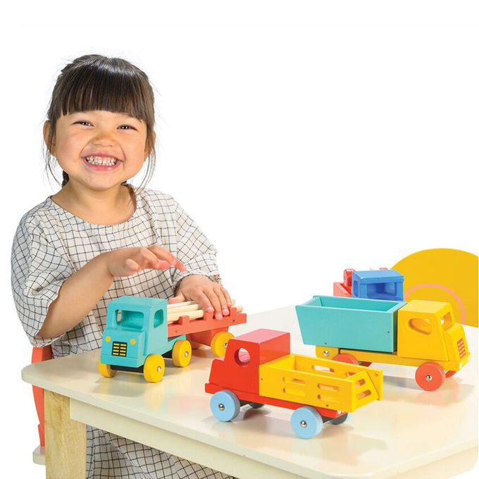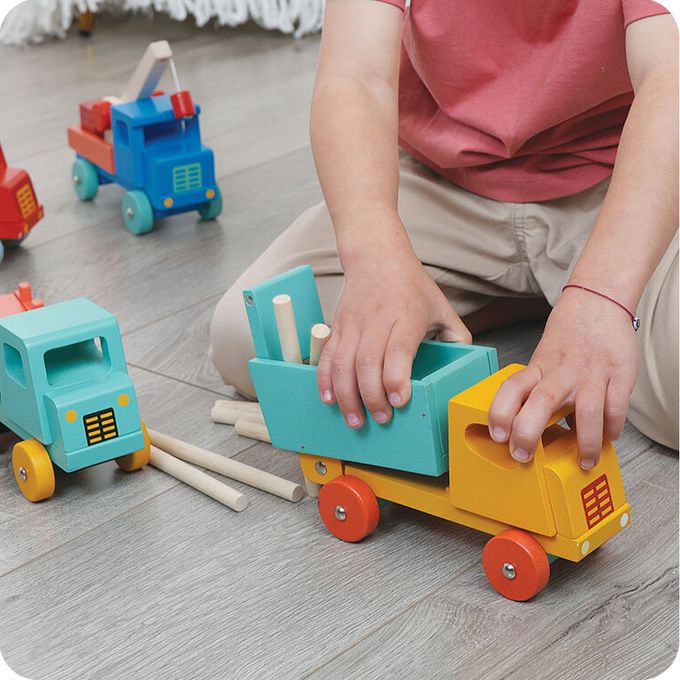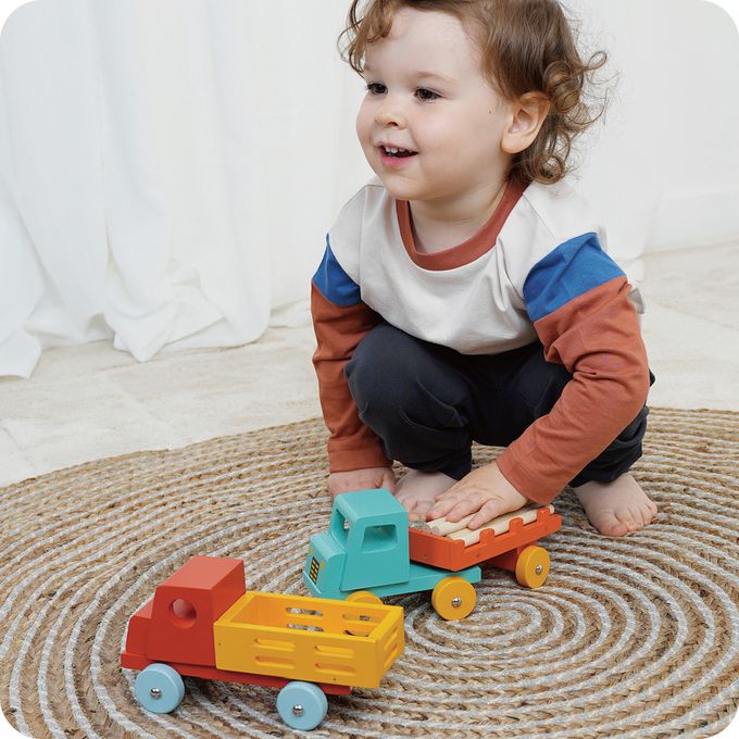 精典復古的運輸車系列,讓孩子沉浸在車車的世界裡面。珊瑚橘與湖水綠配色的森林木材運輸車,將載著木材運送到目的地。用手來回推動和裝載貨物,訓練孩子的手部肌肉和操控能力。