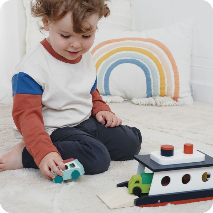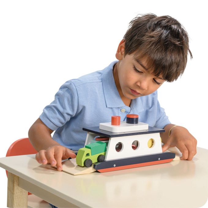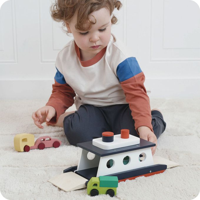 船要啟動了,請要上船的汽車排好隊,守秩序,一台一台開上船。現在依序上船的車子有汽車和露營拖車、露營車和貨車。裝載汽車的渡輪,兩端門板皆可裝卸汽車,讓孩子理解水上運輸的重要性與存在的意義。