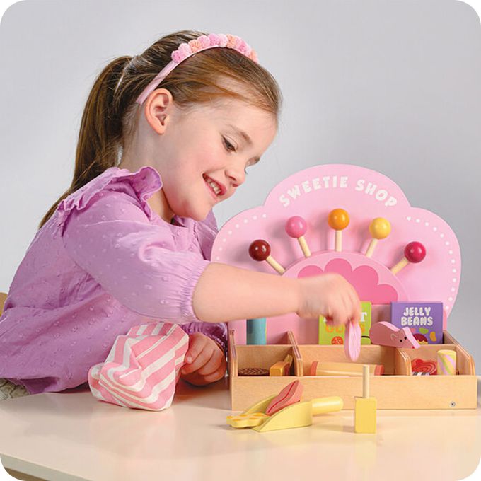 讓我們一起化身為甜蜜糖果鋪的小老闆,歡迎每位顧客走進這間充滿懷舊氛圍的復古糖果店!琳瑯滿目的糖果,像是經典的自助式混合糖果、軟糖和棒棒糖等,整齊擺放在分隔層與裝飾架上,色彩繽紛、十分可口。小老闆可使用專屬的小鏟子挑選糖果,再放到磅秤上秤重後,裝入粉紅條紋布袋交給顧客,完成整個販售與購物的體驗模式。