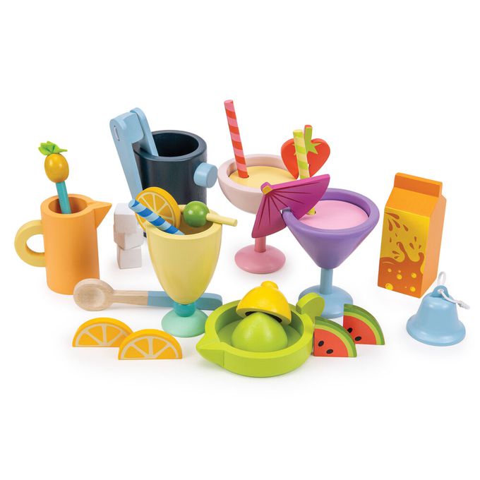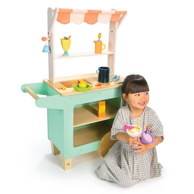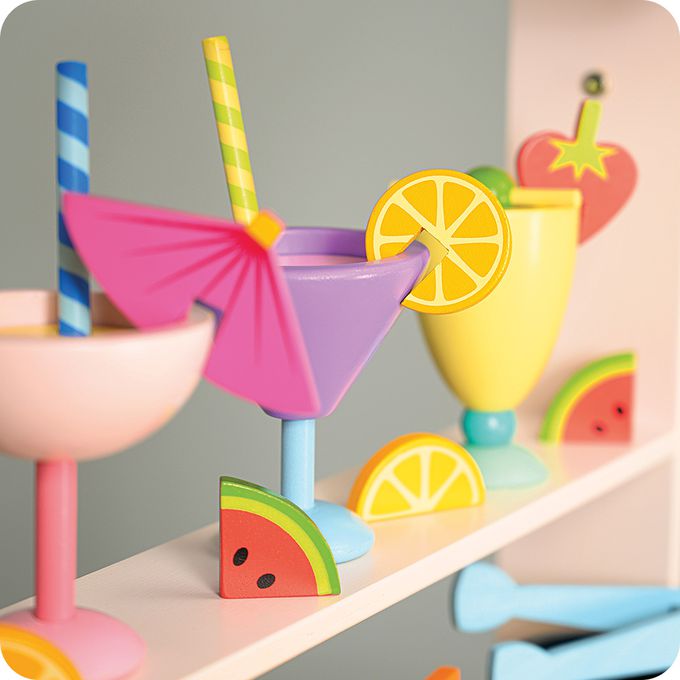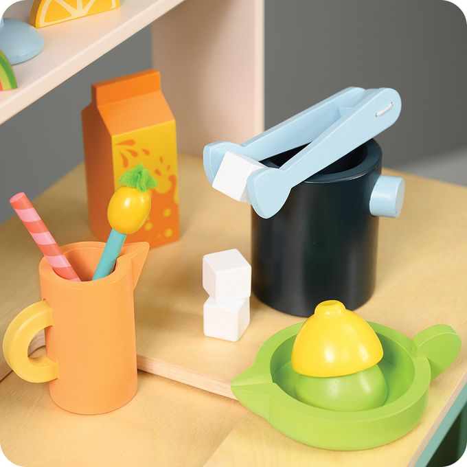 三款不同造型與顏色的飲品杯,搭配小洋傘、切片水果、攪拌棒、條紋吸管與冰塊桶,豐富每一杯飲品的細節且提升層次感。推車設有滑蓋收納空間與下方置物層,可靈活擺放更多遊戲食材,創造出更豐富的角色扮演情境。推車的正面與側邊有設置黑板,可用粉筆書寫歡迎語或當日菜單,增添更多互動樂趣。