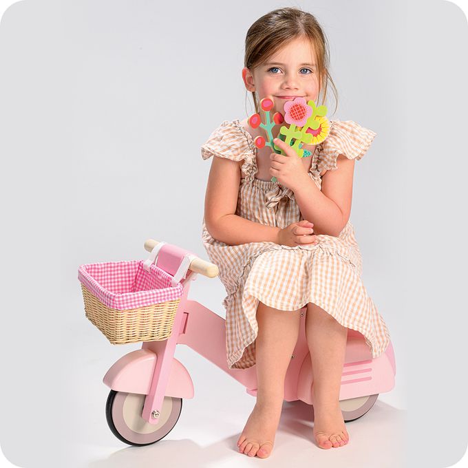 帶著夢幻泡泡的粉紅滑步車來囉!這台可愛造型的滑步車配上粉紅色的柔美外觀,讓每次出門都是焦點。前方有一個可拆式手工藤編置物籃,搭配粉嫩格紋布內襯,不管是載小熊、買菜,還是外出購物都方便。附贈一組貼紙,讓孩子自由裝飾,打造專屬的座騎。