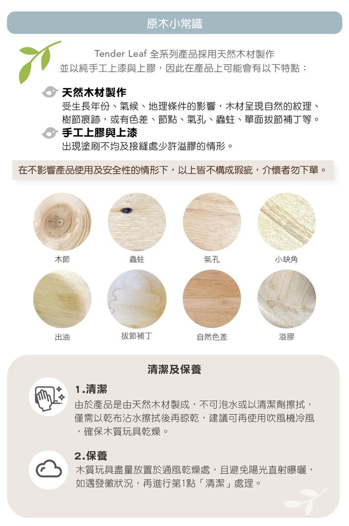 注意事項:木質玩具如有髒汙請勿浸水洗滌,使用乾淨的濕布擦拭,再用乾布擦掉水漬,放在通風處晾乾即可。