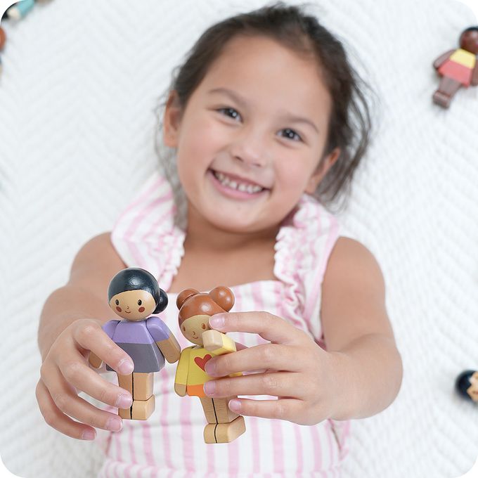 此系列的木偶娃娃採用永續環保橡膠木製成,質感溫潤、手感舒適。每個娃娃擁有可活動的手臂與細緻手工繪製的表情,搭配不同膚色與亮麗服裝,挑選出最貼近自己家庭樣貌的角色,玩出歸屬感與共融價值。