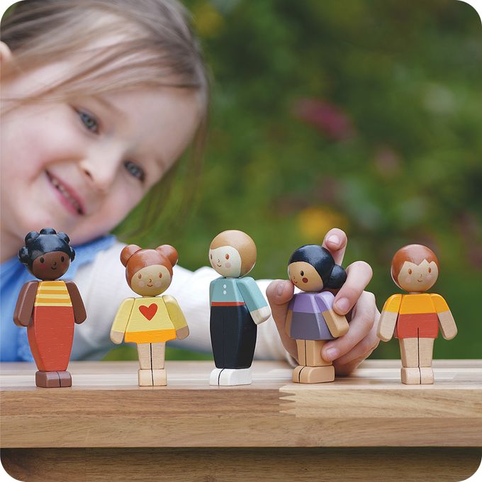 此系列的木偶娃娃採用永續環保橡膠木製成,質感溫潤、手感舒適。每個娃娃擁有可活動的手臂與細緻手工繪製的表情,搭配不同膚色與亮麗服裝,挑選出最貼近自己家庭樣貌的角色,玩出歸屬感與共融價值。