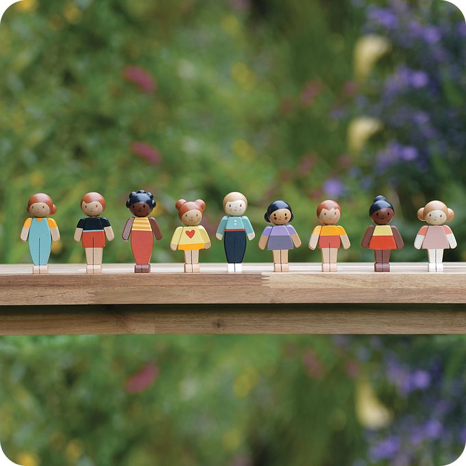 此系列的木偶娃娃採用永續環保橡膠木製成,質感溫潤、手感舒適。每個娃娃擁有可活動的手臂與細緻手工繪製的表情,搭配不同膚色與亮麗服裝,挑選出最貼近自己家庭樣貌的角色,玩出歸屬感與共融價值。