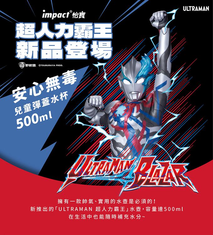 人氣經典角色超人力霸王Ultraman中布雷薩帥氣降臨你的日常,水壺容量500ML,完美結合實用與童趣。選擇IMPACT怡寶Tritan水壺隨時保持水分,健康又時尚,和還原度100%的布雷薩一起用實際行動保衛地球的環保和平而戰。