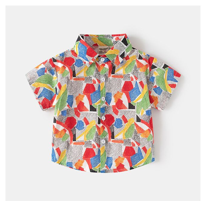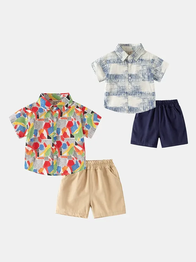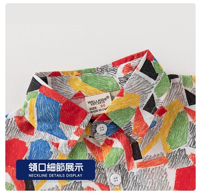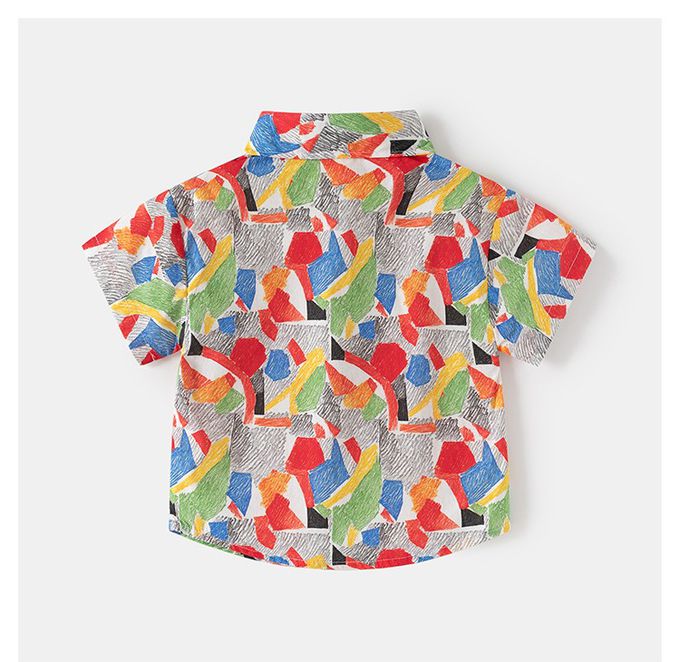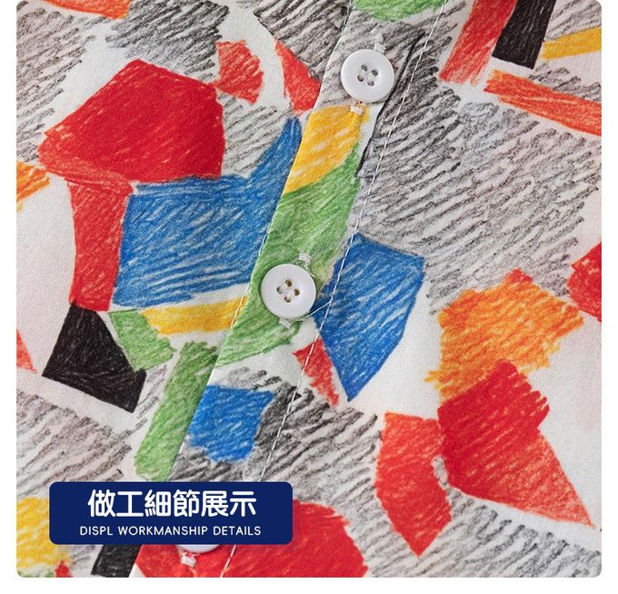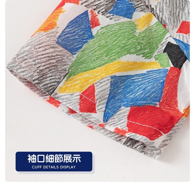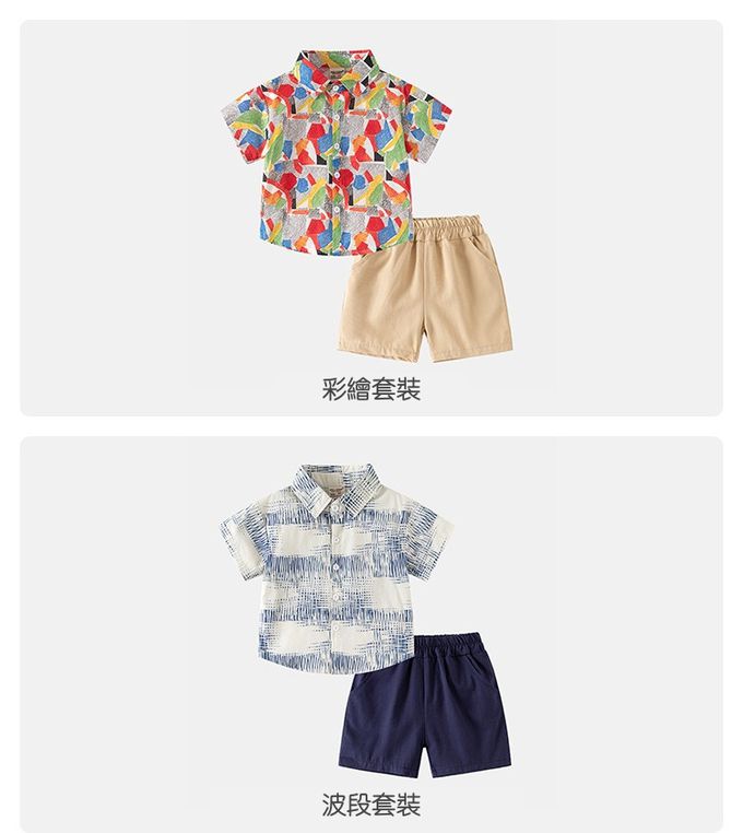 休閒翻領短袖襯衫+五分褲套裝-彩繪-多彩