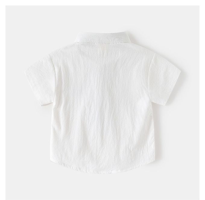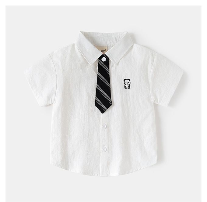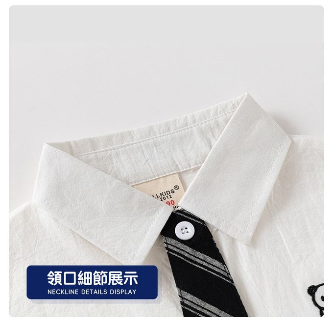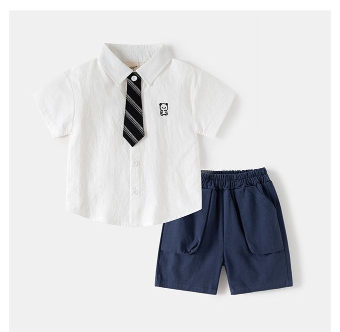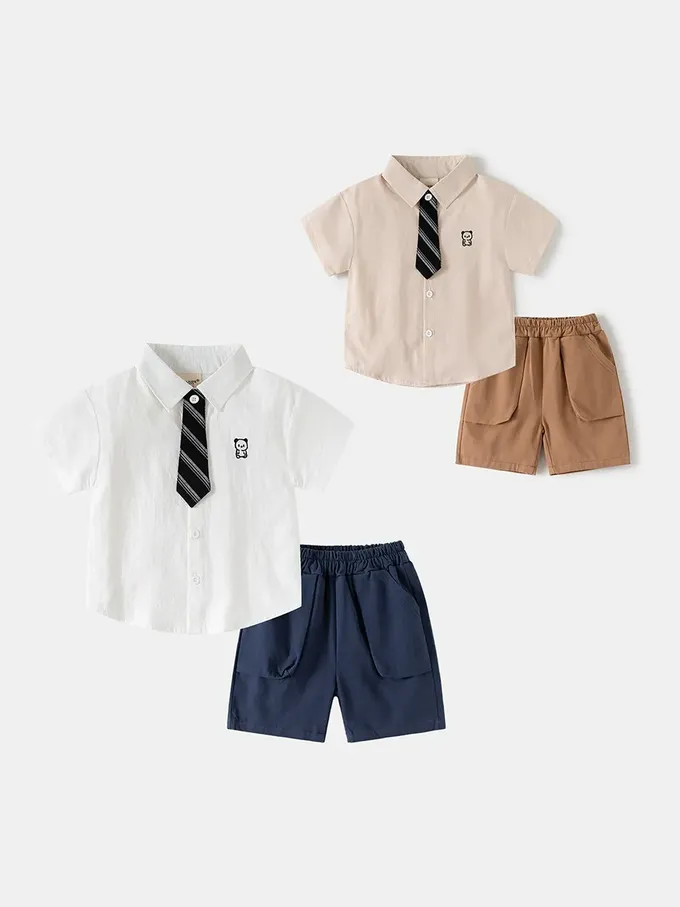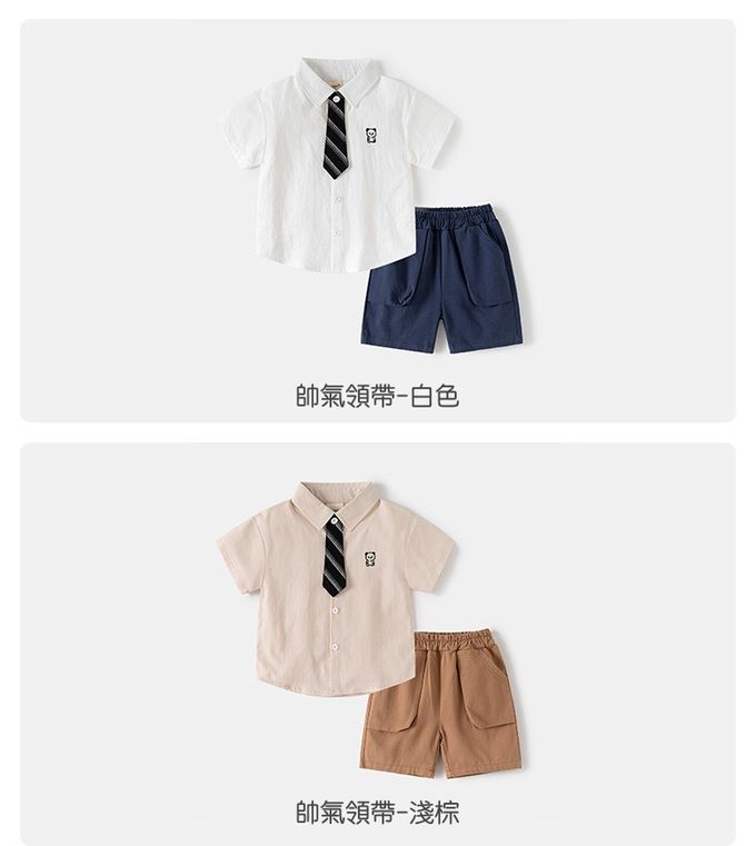 休閒翻領短袖襯衫+五分褲套裝-帥氣領帶-白色