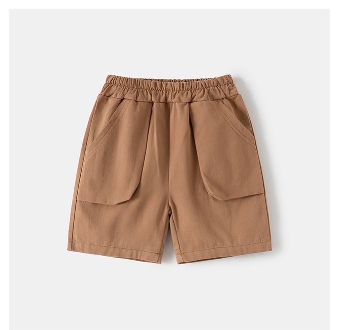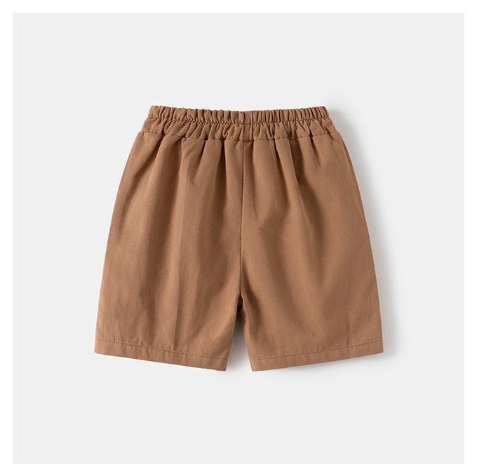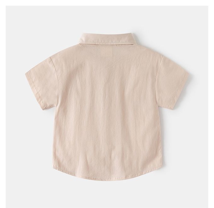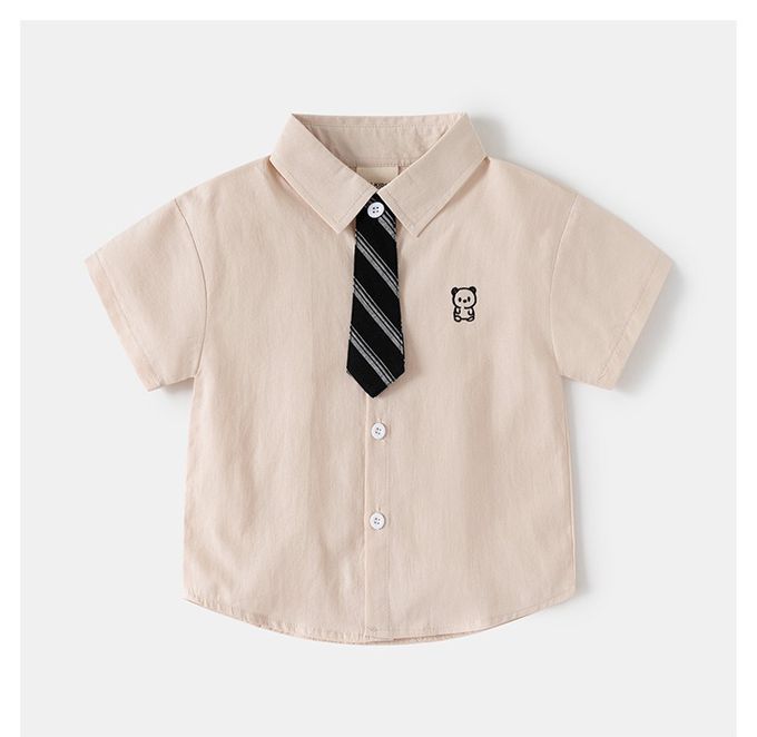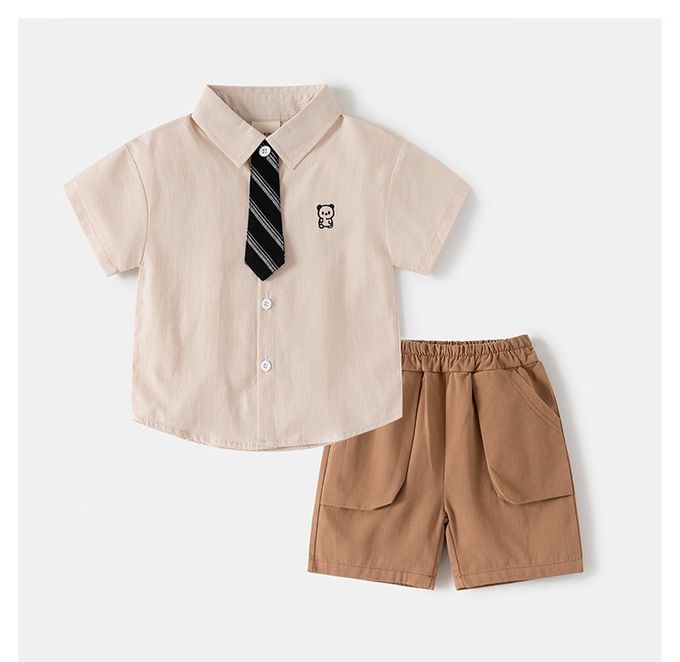 休閒翻領短袖襯衫+五分褲套裝-帥氣領帶-淺棕