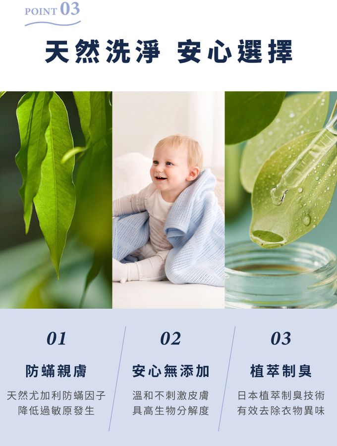 雙重潔淨:天然椰子油皂液+脂肪酵素,雙重潔淨配方,有效去除食物污漬及織物深層髒污。防蟎親膚:添加天然尤加利防蟎因子,降低過敏原發生。