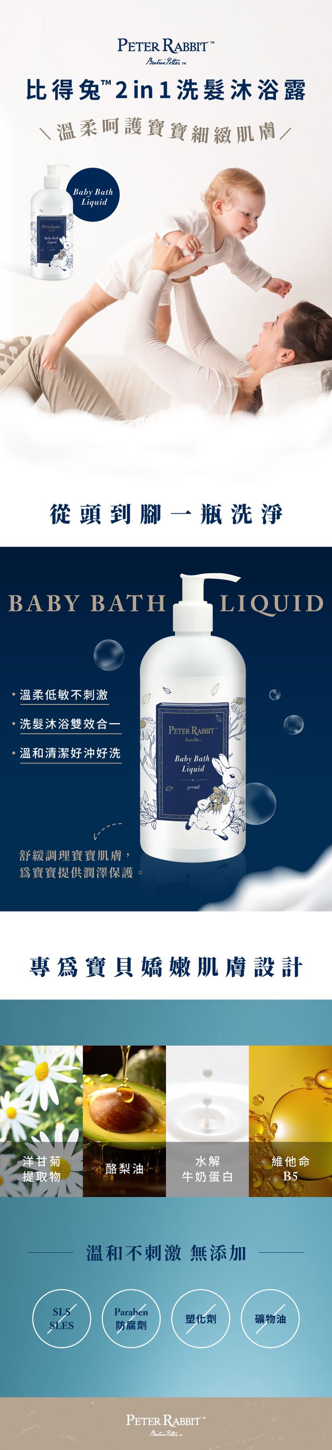 富含洋甘菊提取物、酪梨油、水解牛奶蛋白及維他命B5,滋潤肌膚及頭髮