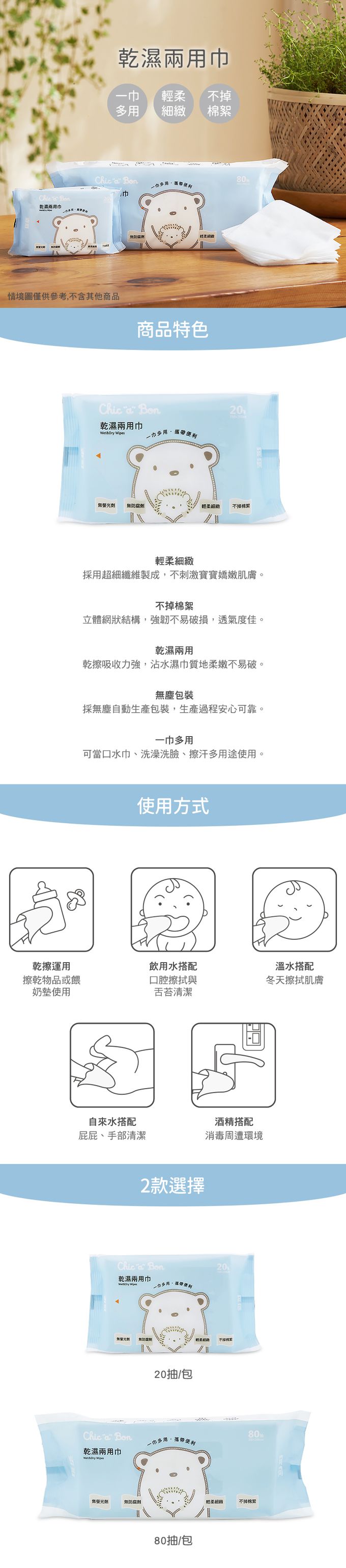 依用途需求不同,乾濕兩用皆宜;乾擦吸收力強,沾水後即可以當濕巾用,質地柔嫩不易破。