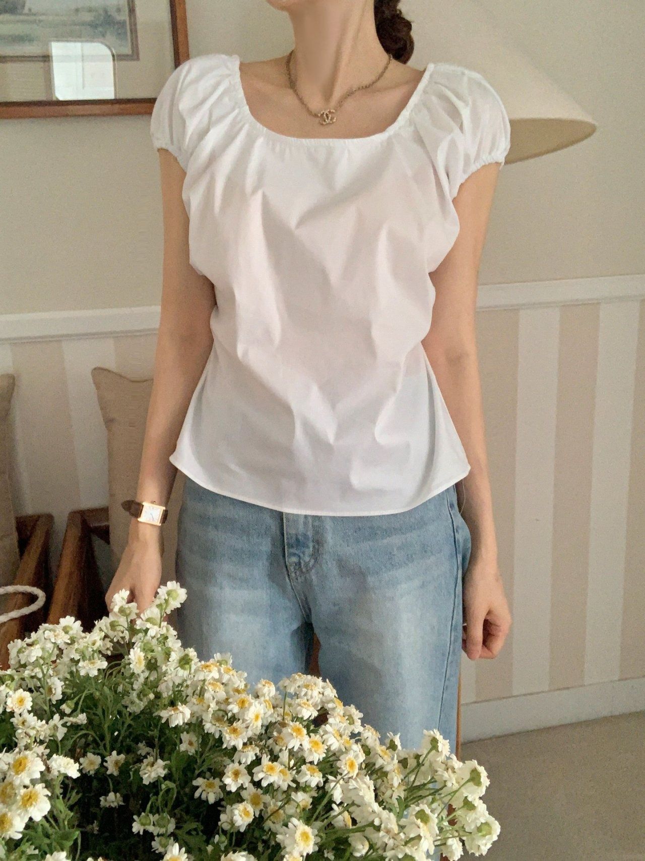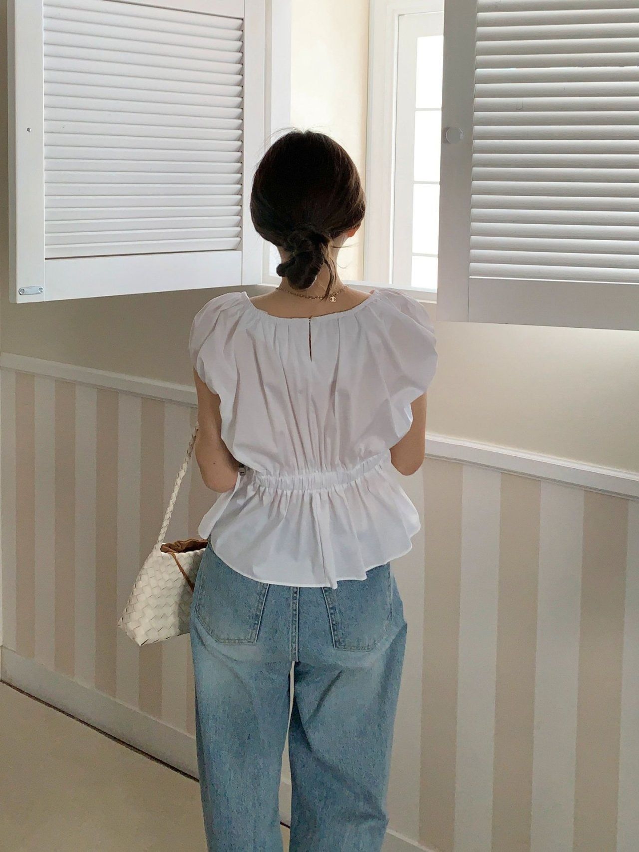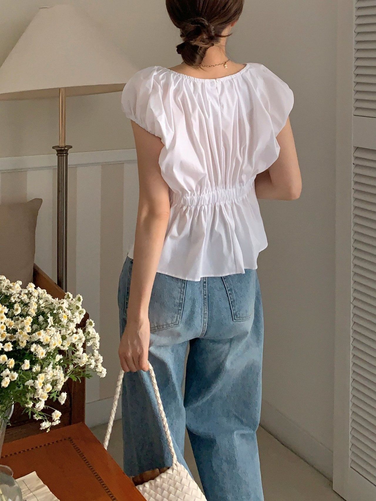 韓國女裝連線 - 顯瘦後背抓褶造型包袖襯衫-白 (FREE)