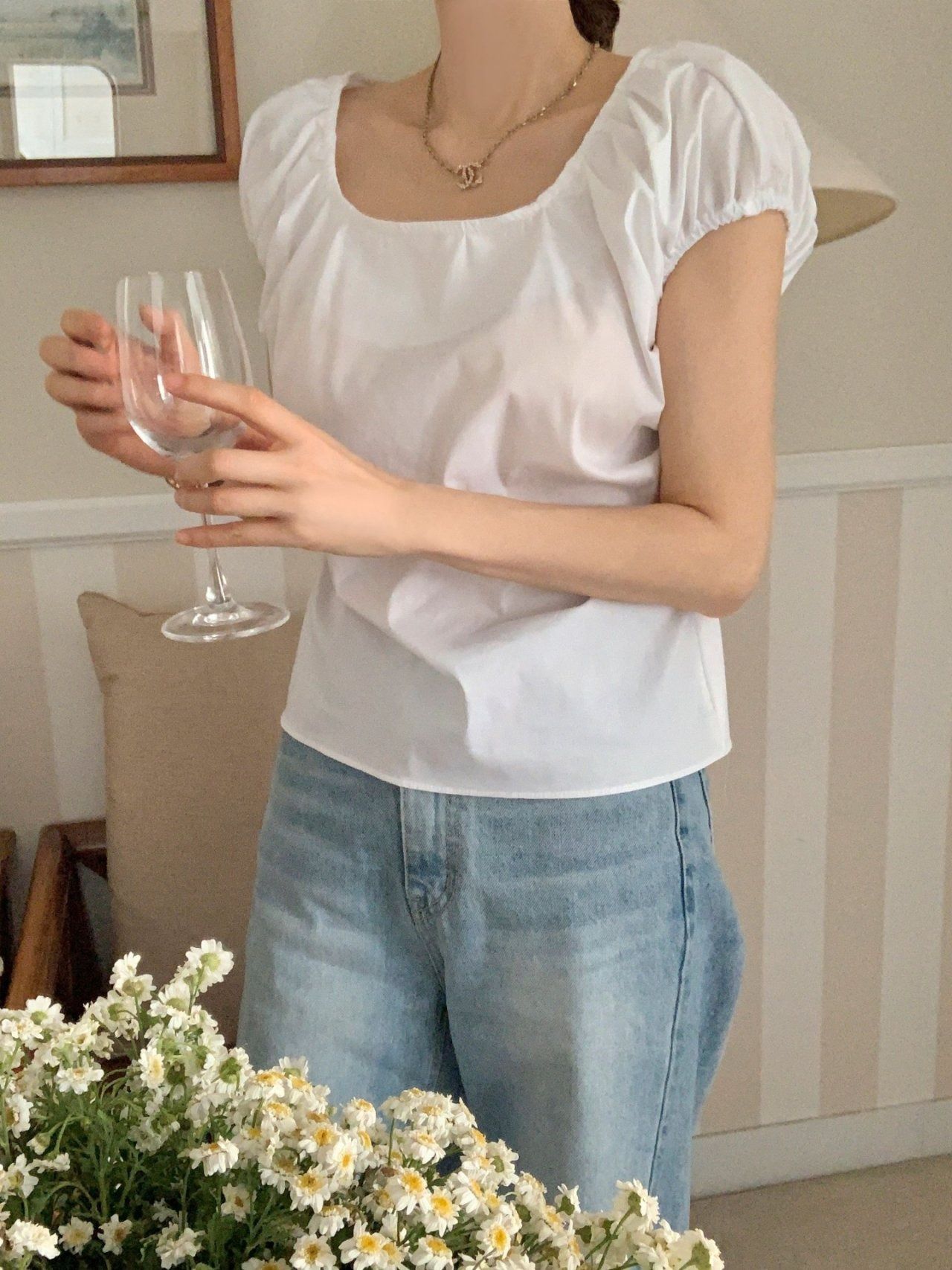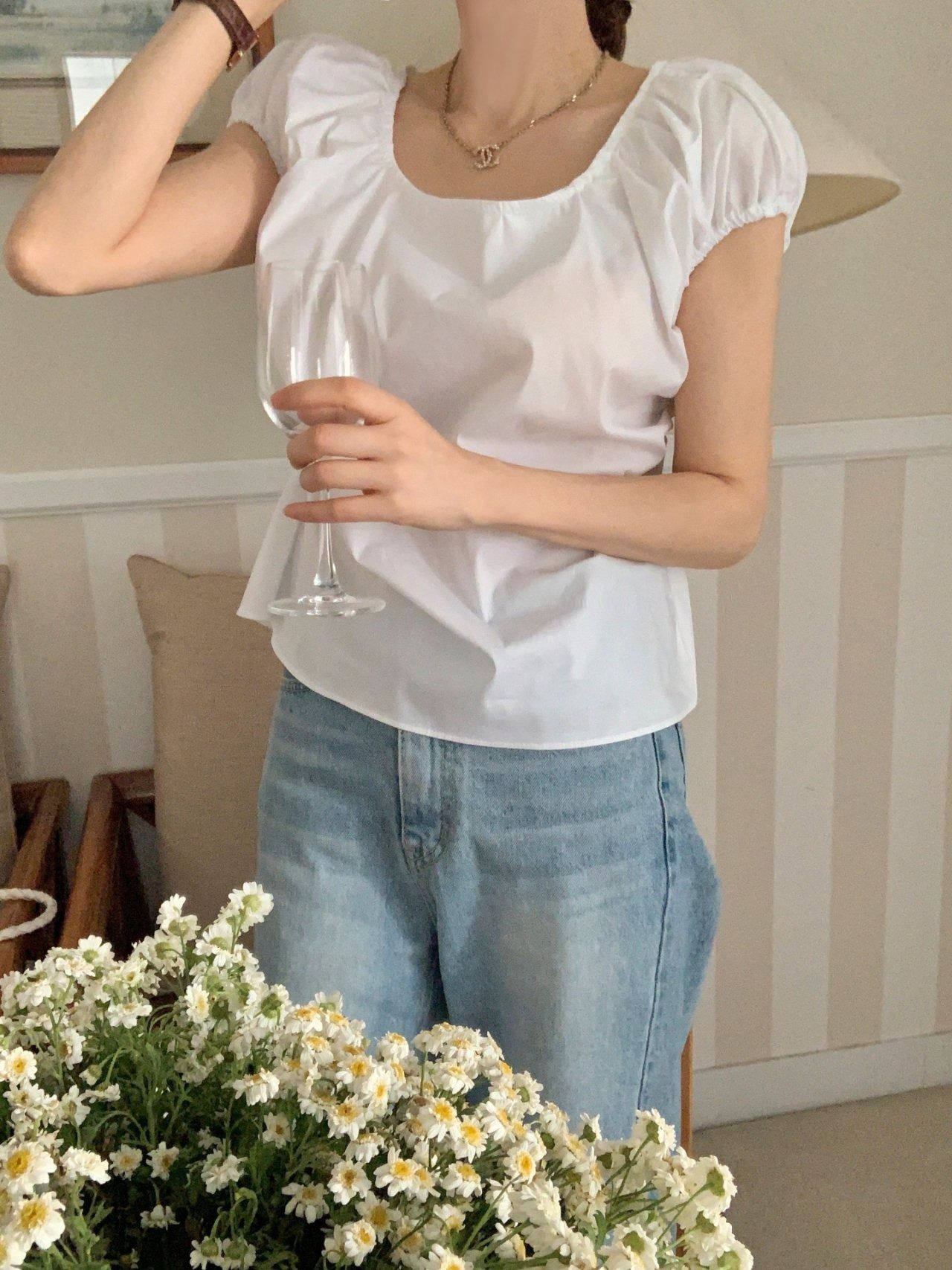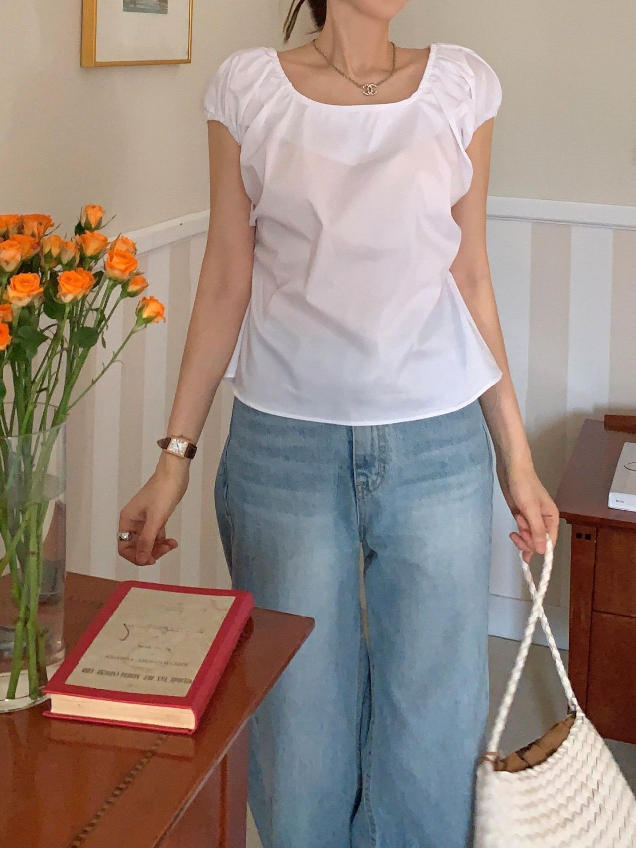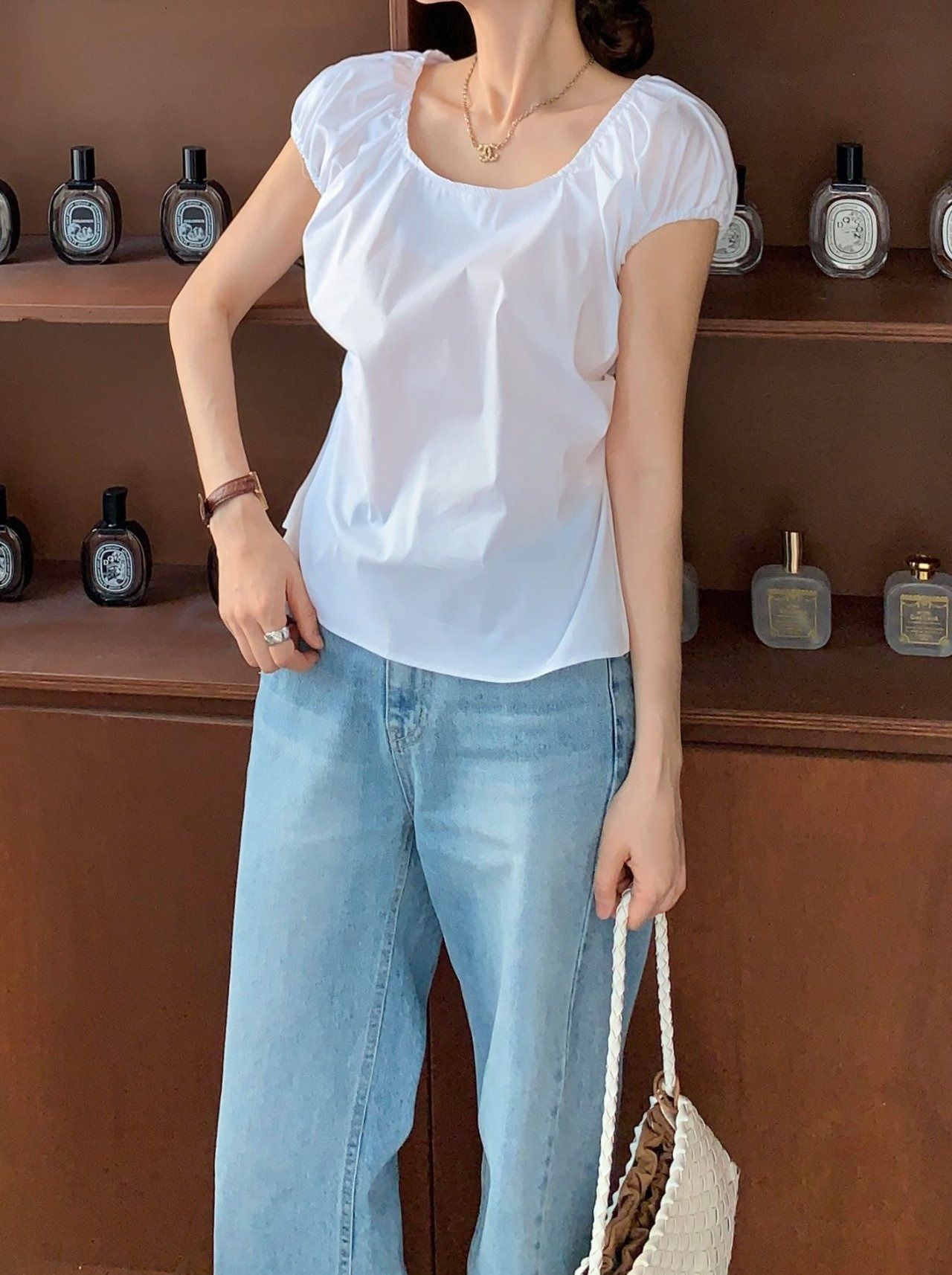韓國女裝連線 - 顯瘦後背抓褶造型包袖襯衫-白 (FREE)