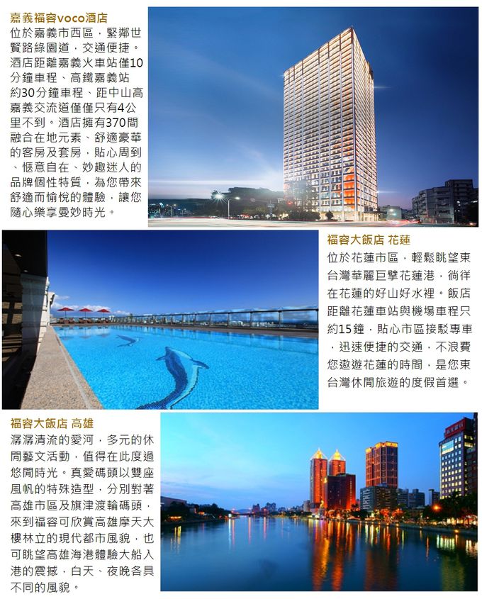 6.福容連鎖及嘉義福容voco酒店入住時間為15:00後、徠旅入住時間為16:00後;退房時間皆為中午11:00前,請依此時段辦理入住及退房。