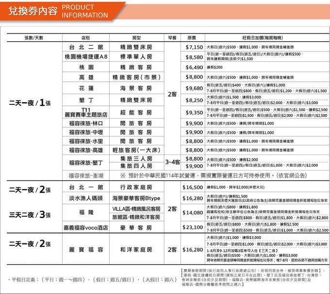 5.持券入住各分店,於國定連續假日期間(依行政院人事行政總處公告之放假日為準),須依上開附表補足差額;12月31日跨年則須視各店特殊節日定義補足差額使用,農曆春節期間依現場專案價補足差額使用。