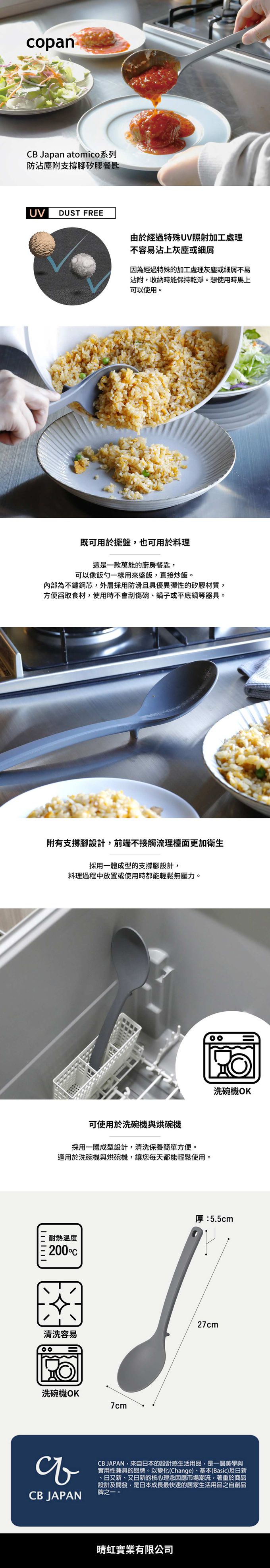 防沾染灰塵的矽膠餐匙,附有支撐腳,容易擺放更加衛生。具有優異彈性的矽膠材質,可以輕鬆不費力地舀取食材,使用時也不會刮傷碗盤或鍋具。一體成型的無縫設計讓污垢更容易清除,可使用洗碗機清洗,保養起來非常輕鬆簡單。