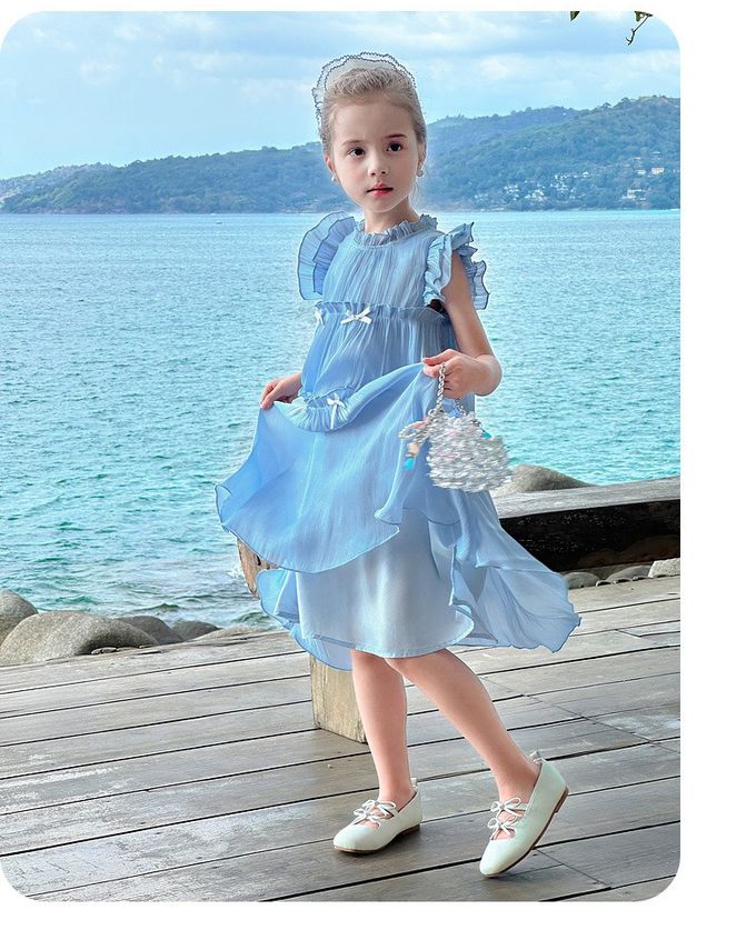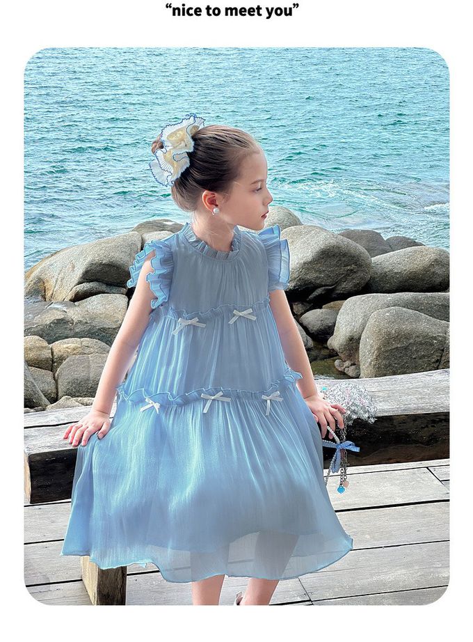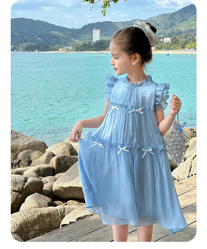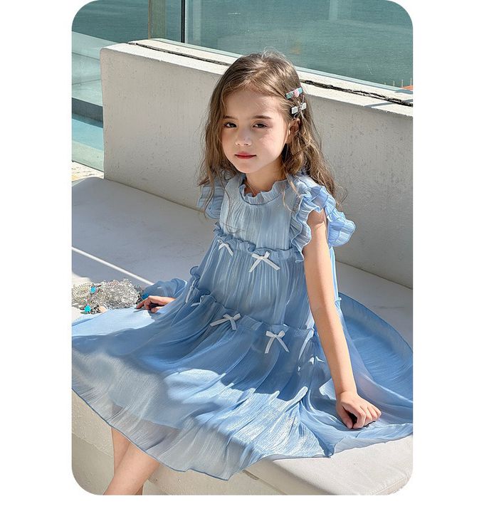 夢幻皺摺荷葉邊小飛袖洋裝-蝴蝶結-藍色