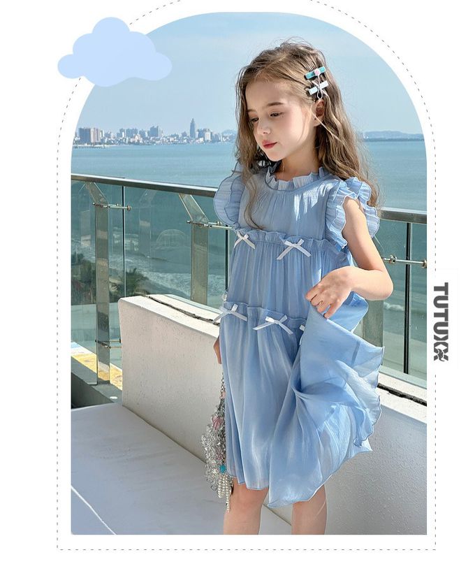 TUTU - 夢幻皺摺荷葉邊小飛袖洋裝-蝴蝶結-藍色