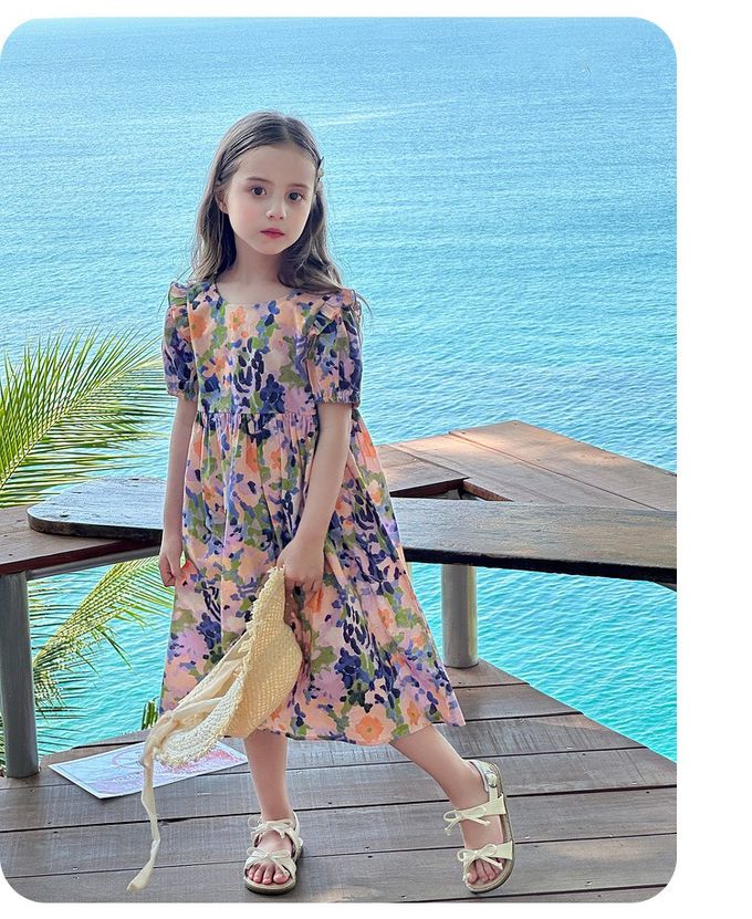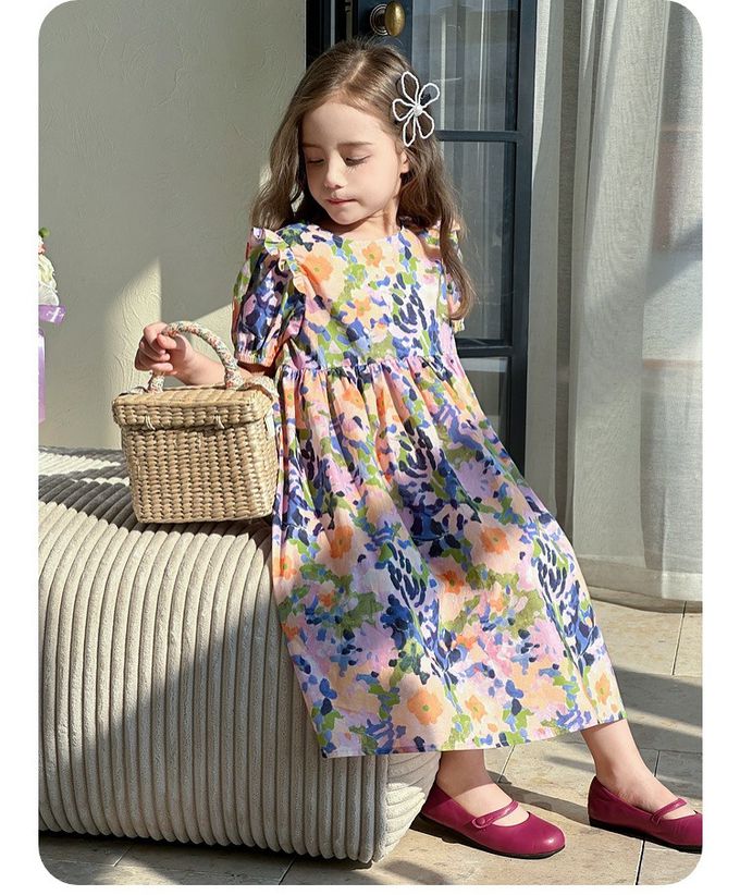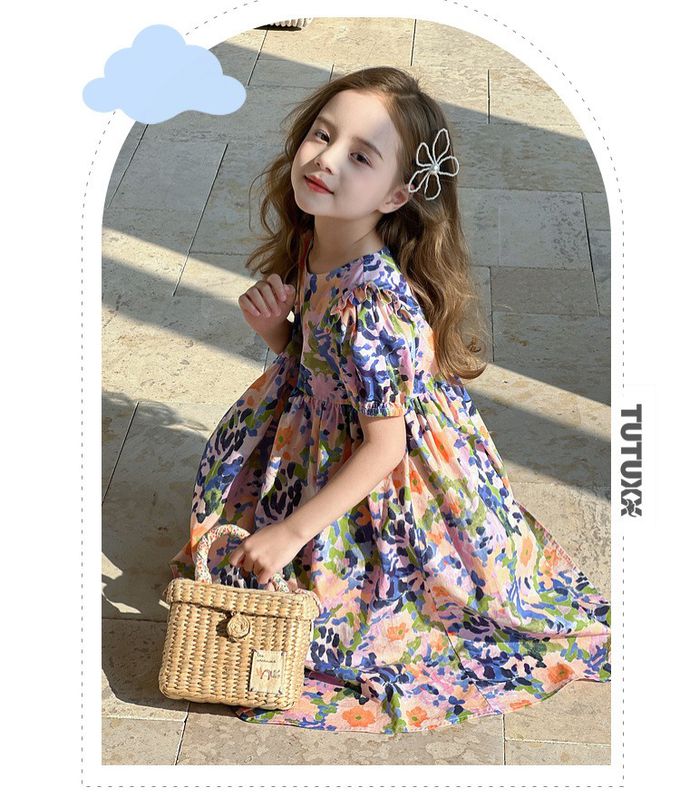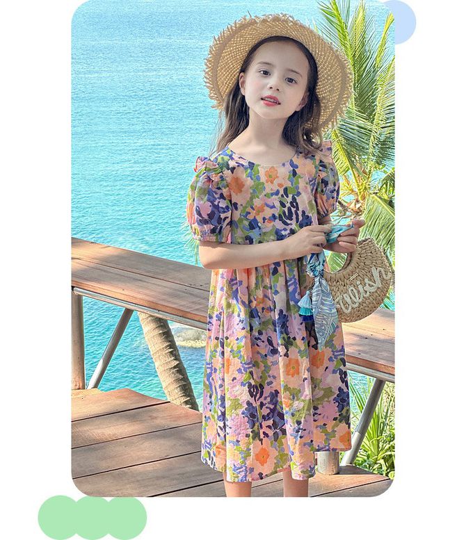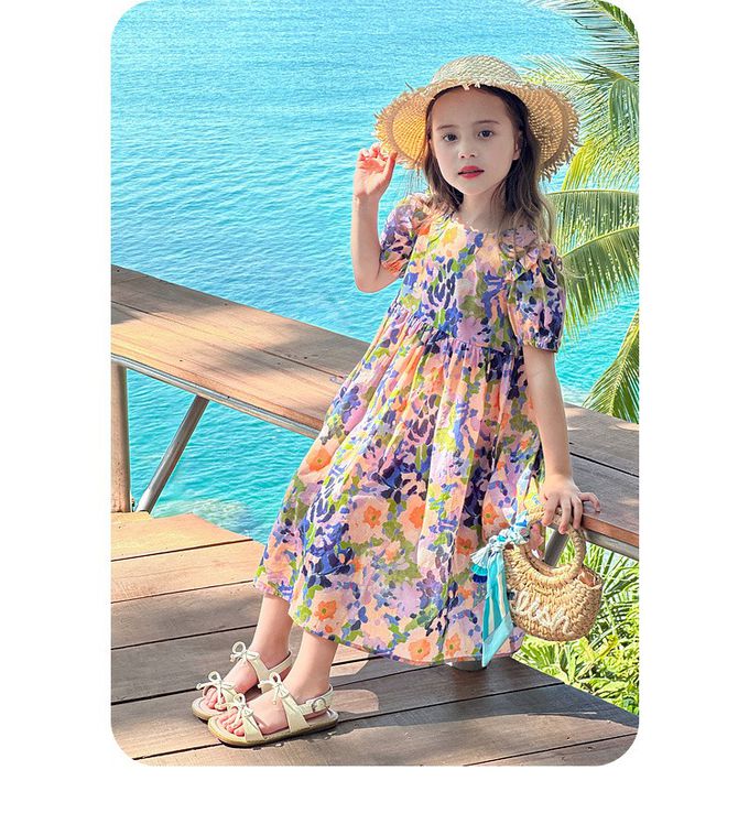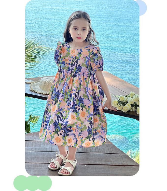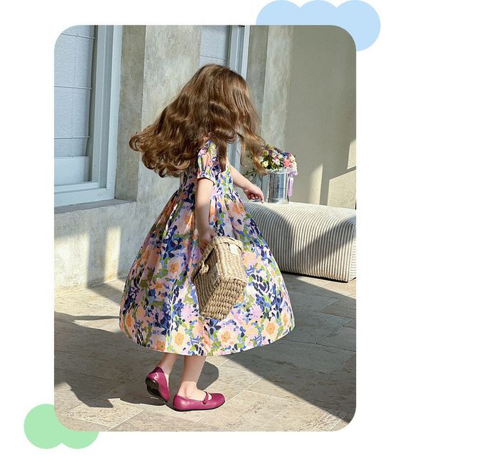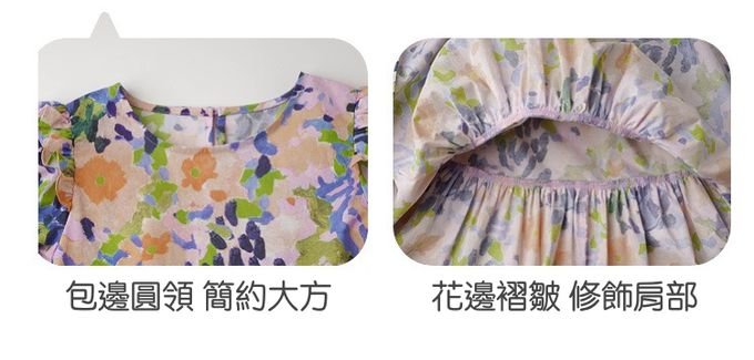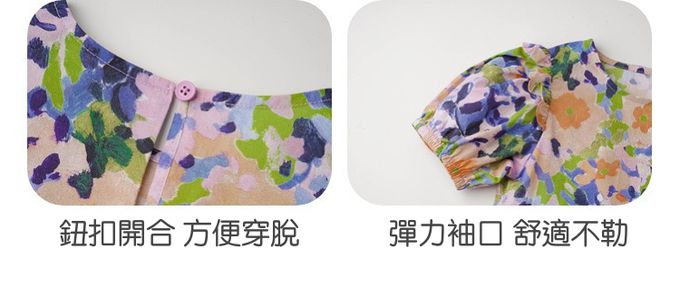 純棉法式浪漫小包袖洋裝-印花-粉紫色